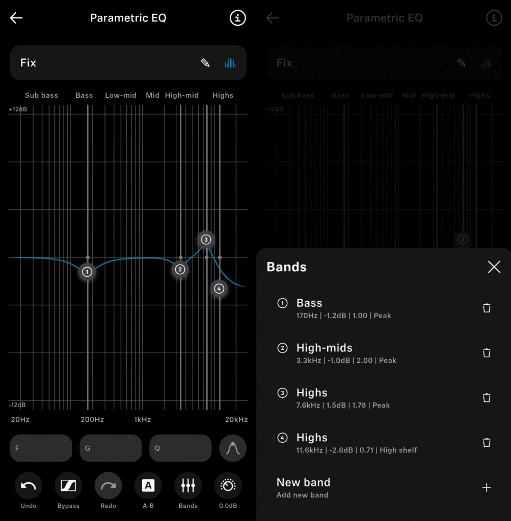 Sennheiserin parametrinen korjain on yksi markkinoiden parhaista, sillä se sallii viisi täysin vapaavalintaista filtteriä, jotka voivat olla Peak, Low Shelf tai High Shelf -tyyppisiä. Taajuus ja Q-arvo ovat niin ikään täysin vapaasti valittavissa, mutta muutoksen voimakkuus on rajattu enintään kuuteen desibeliin ylös- tai alaspäin. Tämä onkin ihan järkevää, jottei kuulokkeiden vahvistimesta lopu teho kesken.