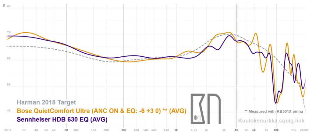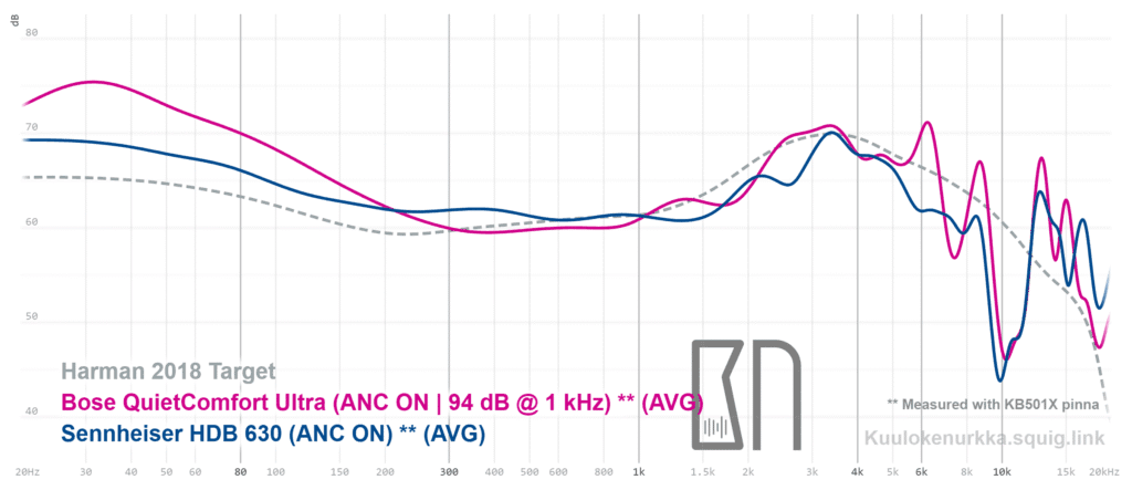 Äänenlaadun osalta ei ole syytä unohtaa sitä, että BTD 700 -lähetin sisältyy HDB 630:n pakkaukseen, jolloin kuluttaja saa suoraan kaiken tarvitsemansa. Bosen kohderyhmän en sen sijaan usko tietävän Bluetooth-koodekeista erityisen syvällisesti, joten erillislähettimen hyötyjä ei välttämättä tiedosteta. Näin ollen sellainen suurella todennäköisyydellä jää hankkimatta, minkä myötä kuuntelu tapahtunee AAC- tai SBC-koodekilla HDB 630:n parempien AptX-vaihtoehtojen sijaan. Toisaalta Bosen kuulokkeet ovat älykkäämmät mitatessaan käyttäjän korvien akustisen impedanssin ja optimoidessaan ääntä sen pohjalta. Lisäksi kuulokkeet säätävät myös basson ja diskantin tasoa dynaamisesti kuuntelun aikana. Tämän vuoksi seuraavia QuietComfort Ultran taajuusvastemittauksia ei kannata ottaa liian kirjaimellisesti, koska suurella todennäköisyydellä vaste on hieman erilainen jokaisen eri ihmisen korvilla.
