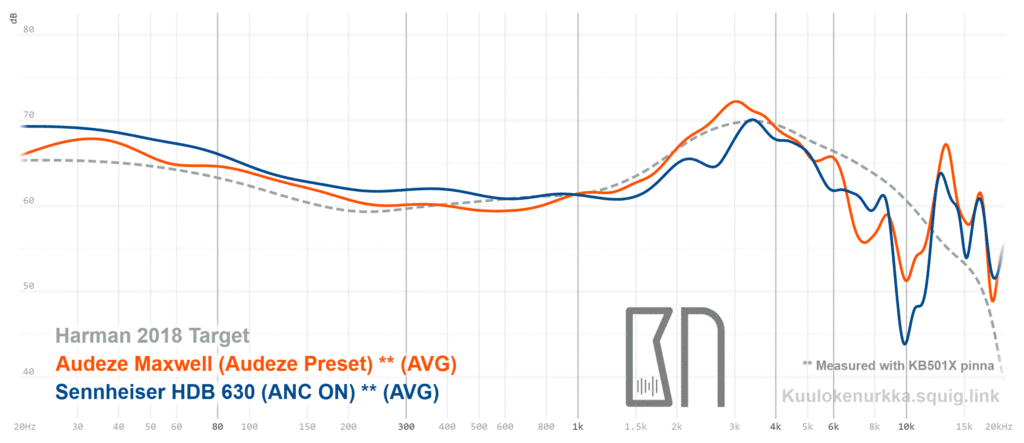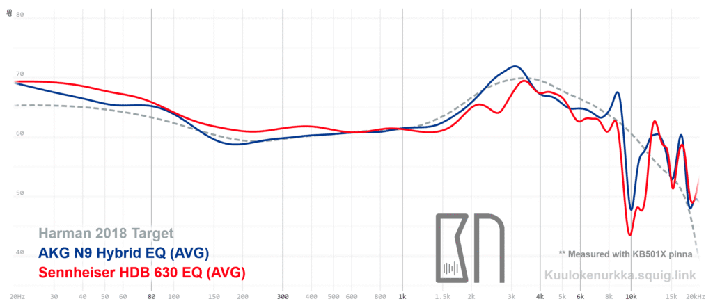 Kuulokkeiden taajuusvastemittaukset on tehty IEC711-standardin mukaisella laitteistolla ja KB501X-mallisilla silikonikorvilla. Kuvaajissa käytetään vertailupohjana tieteelliseen tutkimukseen pohjautuvaa Harmanin tavoitekäyrää (vuoden 2018 versio), joka on yleistys siitä, millaisen taajuusvasteen mukainen ääni kuulostaisi suurimman osan mielestä hyvältä ja vastaisi tasapainoisia kaiuttimia hyvin akustoidussa huoneessa. Lisätietoa mittauksista ja niiden tarkkuudesta löytyy Taajuusvastemittaukset-sivulta. HDB 630:n taajuusvaste on myös vertailtavissa muiden mitattujen kuulokemallien kanssa Squiglink-vertailutyökalun avulla.