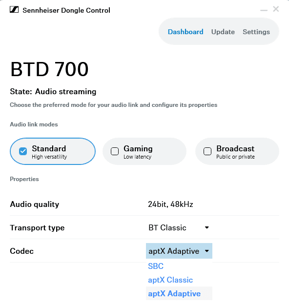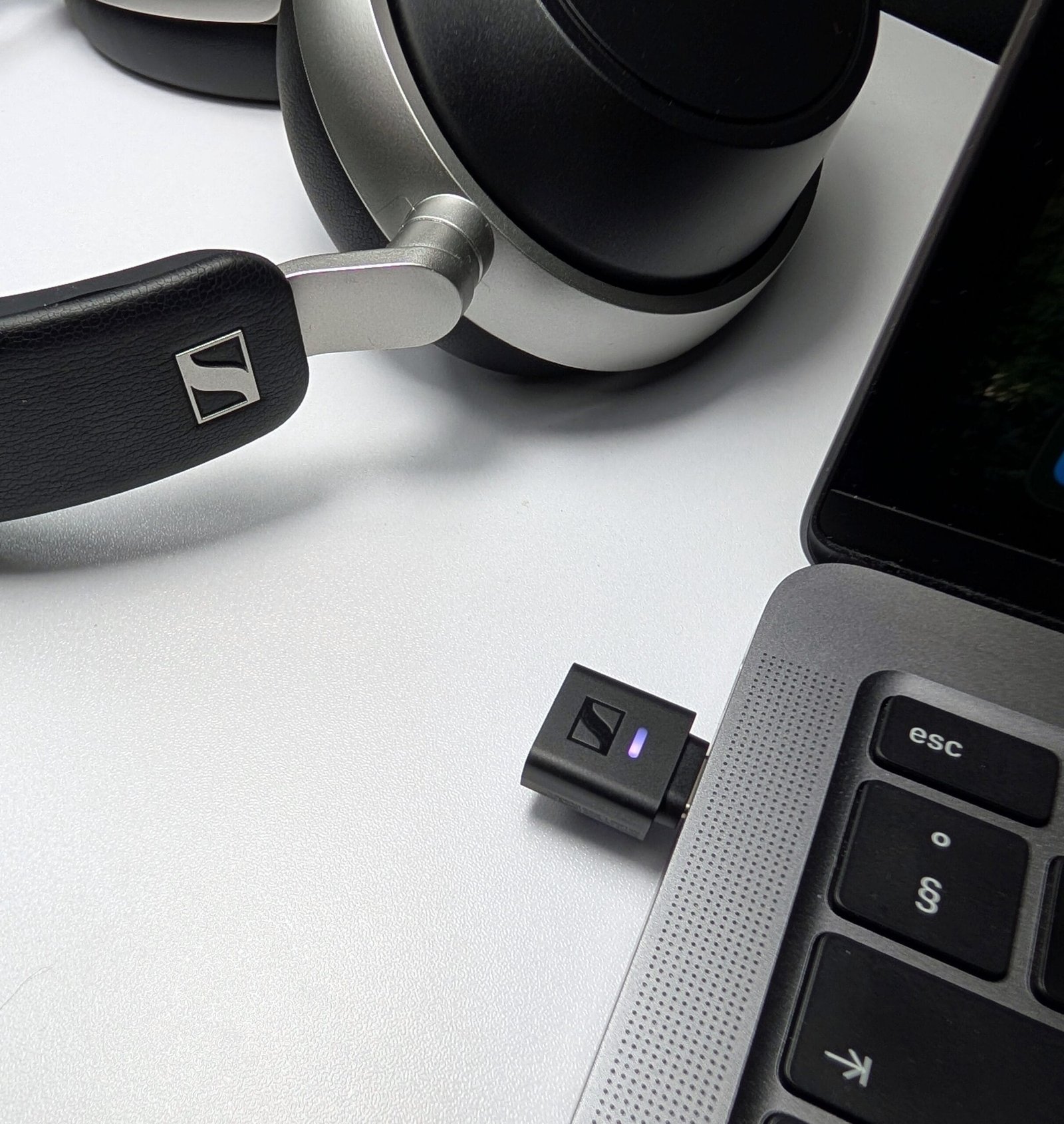 Niin ikään Bluetooth-toteutus vastaa Momentum 4:ää, sillä Bluetooth-versio on aavistuksen vanhentunut 5.2 ja koodekkituki identtinen, eikä kilpailijoista poiketen Google Fast Pair -ominaisuutta vieläkään tarjota. Tällä kertaa erillisen BTD 700-lähettimen ansiosta yhä useammat pääsevät kuitenkin hyödyntämään HDB 630:n kanssa AptX Adaptive -koodekkia, sillä se toimisi jopa Applen laitteissa. Jotkut varmasti joutuvat edelleen turvautumaan Android-maailmassa USB Audio Player Pro -sovellukseen, mutta suosittelen muutoinkin sen ostamista, jos maksimaalinen Android-äänenlaatu kiinnostaa. Windows- ja Apple-ympäristössä BTD 700:lle voidaan puolestaan asentaa Sennheiser Dongle Control -sovellus, jolla Bluetooth-tila ja -koodekit ovat hallinnoitavissa. Toisaalta erillislähettimen käyttäminen ei ole pakollista, vaan HDB 630 toimii myös ilman sitä esimerkiksi suoraan matkapuhelimeen yhdistettynä.