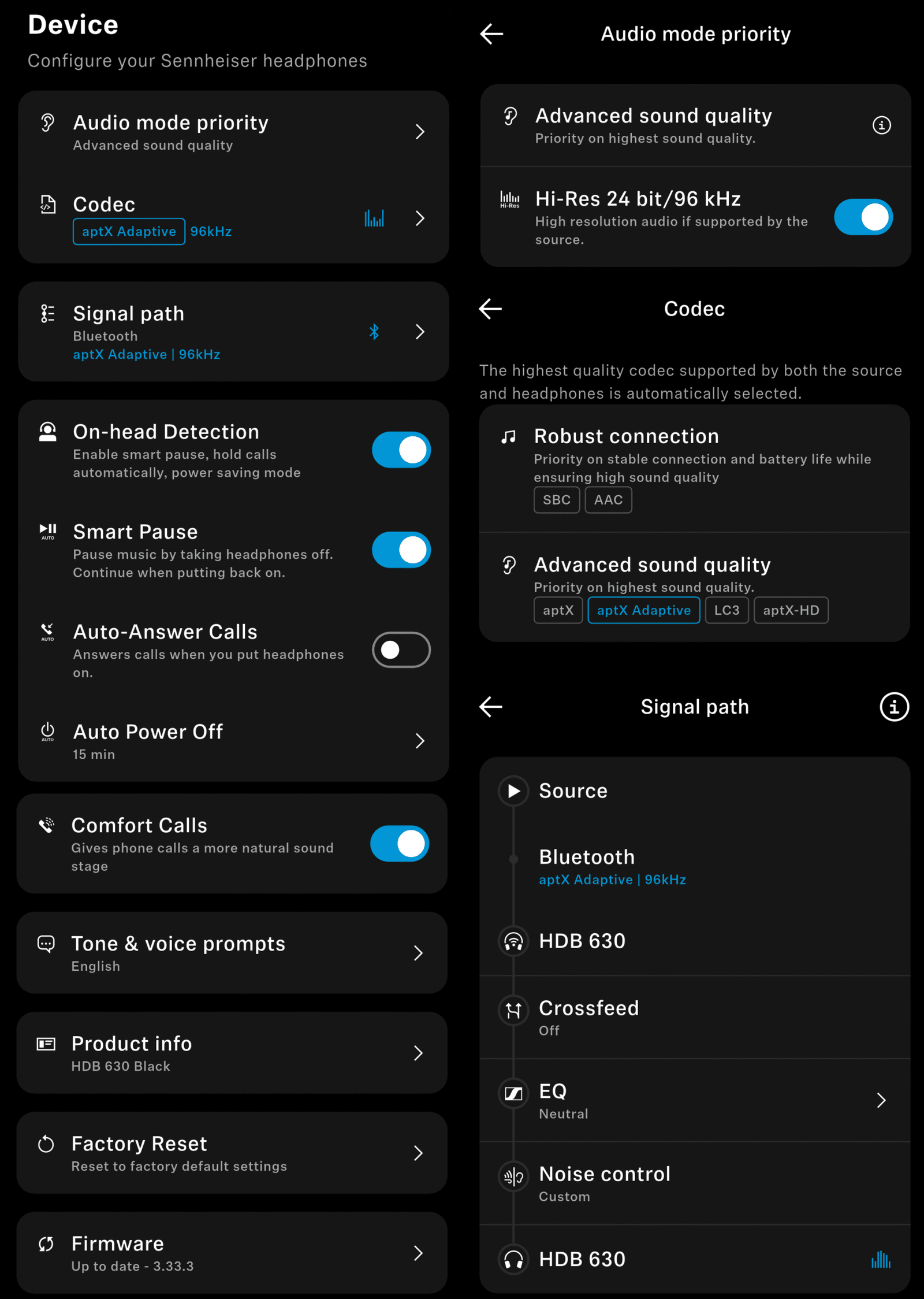 HDB 630:n tarpeisiin kehitetty SmartControlPlus-sovellus sisältää uusina ominaisuuksina Crossfeed-toiminnon ja parametrisen taajuuskorjaimen. En myöskään muista vanhemman sovelluksen sisältäneen signaalitien esittävää infonäkymää, mikä on kuunteluun intohimoisesti suhtautuville audiofiileille ihan mukava lisä. Muut ominaisuudet sen sijaan ovat jo Momentum 4:stä tuttuja eli käyttäjä pääsee muuttelemaan muutamia asetuksia, säätämään vastamelutoimintoa ja määrittämään käyttötiloja erilaisiin kuunteluympäristöihin. Parametrisen taajuuskorjaimen lisäksi sovellus sisältää edelleen myös yksinkertaisemman graafisen taajuuskorjaimen, eikä valmiiksi määritettyjä ääniprofiileitakaan ei ole unohdettu, joten säätömahdollisuudet ovat kattavat.