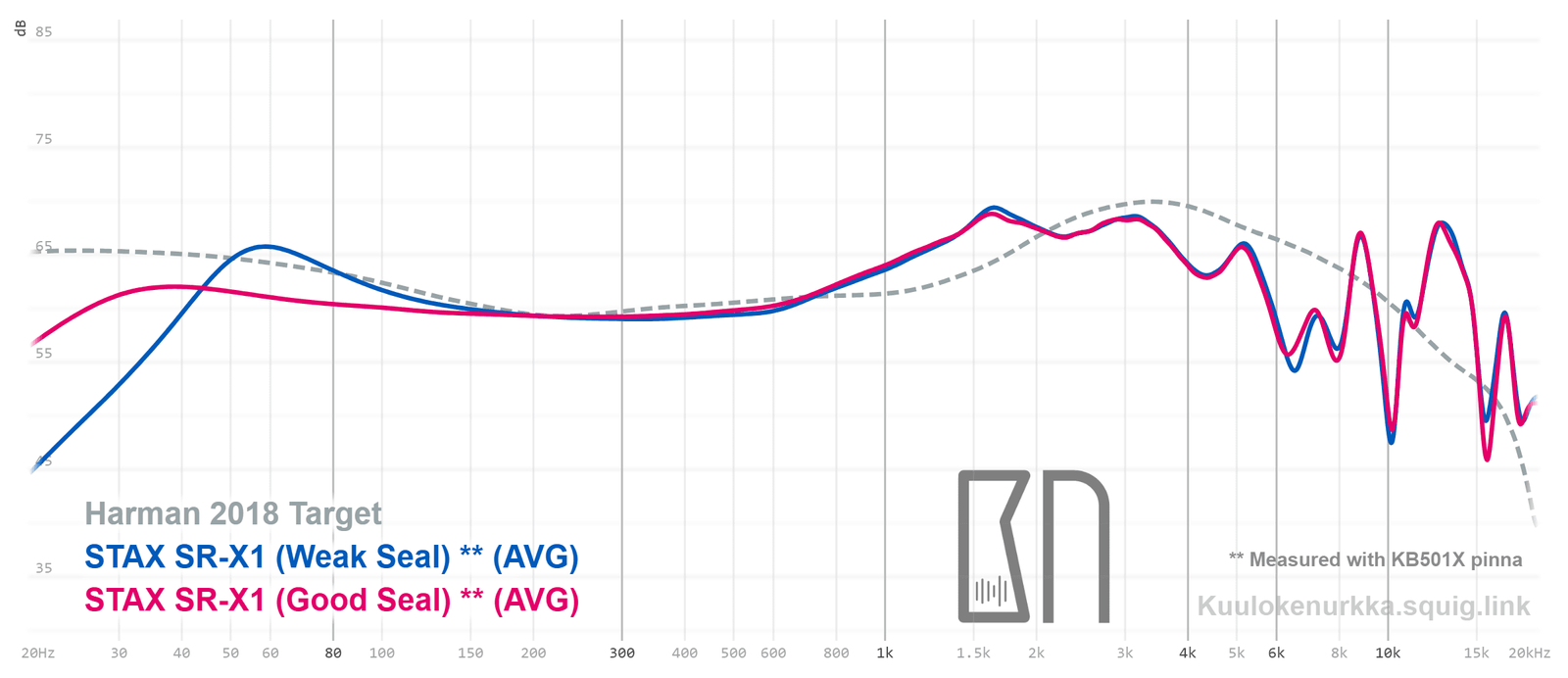 Elektrostaattiset kuulokkeet kykenevät toistamaan alabasson lineaarisesti 20 hertsiin saakka planaarikuulokkeiden tapaan, mutta monissa STAX:in kuulokemalleissa tämä jää toteutumatta kevyen istuvuuden ja varsin kehnojen korvapehmusteiden vuoksi. SR-X1 tuottaa hyvällä istuvuudella mainion määrän alabassoa, kun taas kevyellä istuvuudella basso pomppaa ylöspäin 50–80 hertsin välillä ja romahtaa sen jälkeen voimakkaasti alaspäin 20 hertsiä kohti. Omassa päässäni kuulokkeet istuvat siten, että toteutuva taajuusvaste asettuu kahden mittaamani taajuusvasteen välimaastoon. Basso on tiukkaa istuvuutta muhkeampaa, muttei kuitenkaan heikon istuvuuden kaltaista, sillä pehmusteita enemmän korvilta nostaessa murina lisääntyy edelleen. Pehmusteet tiukasti päähän painamalla bassosta tulisi puolestaan täysin viivasuoraa 20 hertsiin saakka ja 1-2 kilohertsin välinen korostuma tasoittuisi samalla parilla desibelillä. Erilaisella (lujempaa puristavalla) sankaratkaisulla SR-X1:stä oltaisiinkin saatu suunniteltua hyvin erilainen kuuloke.