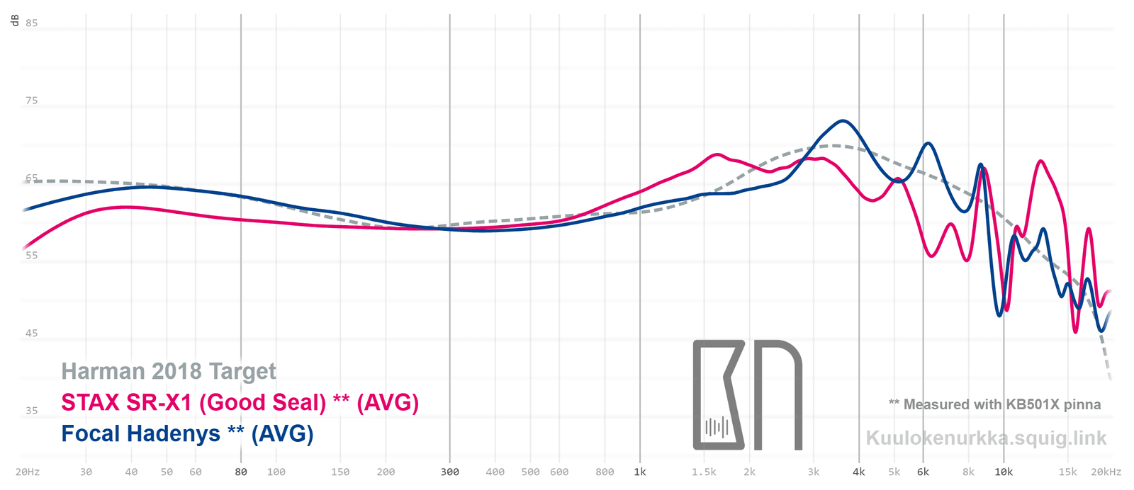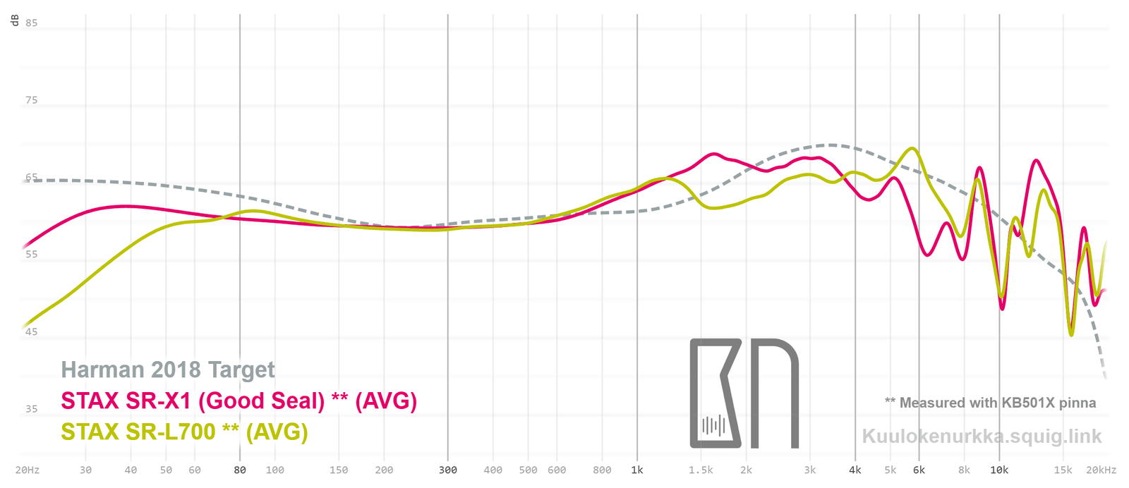 Kuulokkeiden taajuusvastemittaukset on tehty IEC711-standardin mukaisella laitteistolla ja KB501X-mallisilla silikonikorvilla. Kuvaajissa käytetään vertailupohjana tieteelliseen tutkimukseen pohjautuvaa Harmanin tavoitekäyrää (vuoden 2018 versio), joka on yleistys siitä, millaisen taajuusvasteen mukainen ääni kuulostaisi suurimman osan mielestä hyvältä ja vastaisi tasapainoisia kaiuttimia hyvin akustoidussa huoneessa. Lisätietoa mittauksista ja niiden tarkkuudesta löytyy Taajuusvastemittaukset-sivulta. SR-X1:n taajuusvaste on myös vertailtavissa muiden mitattujen kuulokkeiden kanssa Squiglink-vertailutyökalun avulla.