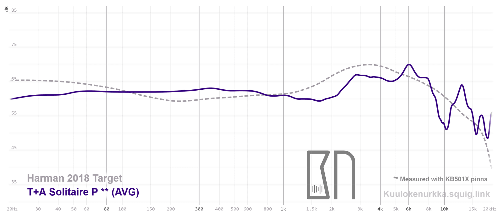 Solitaire P-SE:ssä tällaista kuoppaa ei kuitenkaan ole, mistä voidaan tulkita 10 kHz:n toistuvan ihmisen korvaan vähintään 5 desibeliä toivottua lujemmin. Koska kyseinen taajuus on todettu korostuessaan erityisen ärsyttävän kuuloiseksi, Solitaire P-SE:hen liittyvät ongelmat eivät lopulta yllätäkään minua. Taajuuspyyhkäisylläkin totesin 10–11 kHz:n välin huomattavan korostuneeksi omalla kuuloaistillani. Jos testaamani kuulokkeet eivät ole yksittäistapaus, tämä täytyy laskea selkeäksi T+A:n suunnitteluvirheeksi. Joidenkin kuuloaistilla tämä ei toki välttämättä olisi yhtä paha ongelma, jolloin Solitaire P-SE saattaa kuulostaa paremmalta ja tasapainoisemmalta kuin itselleni.