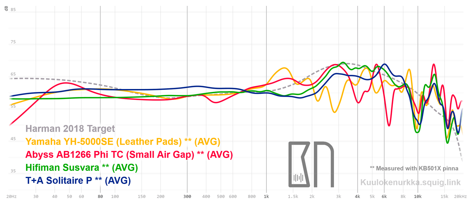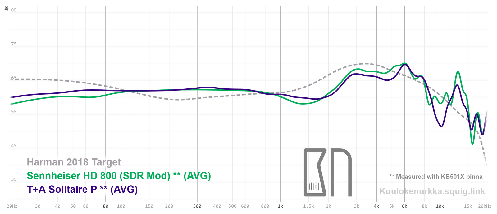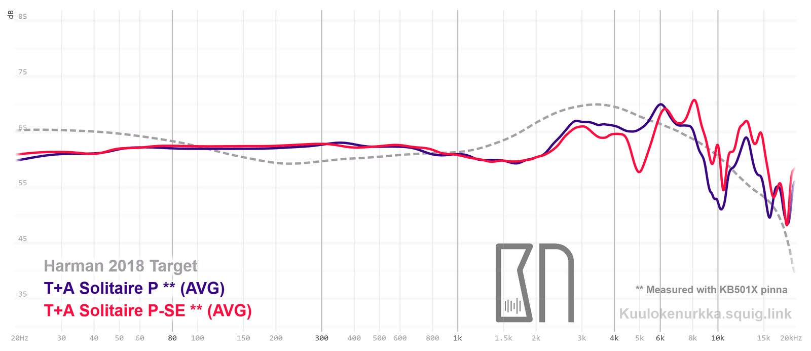 Kuulokkeiden taajuusvastemittaukset on tehty IEC711-standardin mukaisella laitteistolla ja KB501X-mallisilla silikonikorvilla. Kuvaajissa käytetään vertailupohjana tieteelliseen tutkimukseen pohjautuvaa Harmanin tavoitekäyrää (vuoden 2018 versio), joka on yleistys siitä, millaisen taajuusvasteen mukainen ääni kuulostaisi suurimman osan mielestä hyvältä ja vastaisi tasapainoisia kaiuttimia hyvin akustoidussa huoneessa. Lisätietoa mittauksista ja niiden tarkkuudesta löytyy Taajuusvastemittaukset-sivulta. Solitaire-mallien taajuusvasteet ovat myös vertailtavissa muiden mitattujen kuulokkeiden kanssa Squiglink-vertailutyökalun avulla.