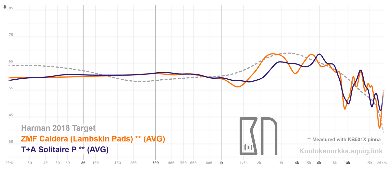 Tarkemmin itselläni oli mahdollista vertailla Solitaire P:tä ZMF Calderaan, joka asettuu noin 4000 euron hinnallaan kahden Solitaire-mallin väliin. Caldera on keskitaajuuksiltaan hyvin erilainen kuuloke, sillä se tuo äänen intiimisti ja elävästi melko lähelle. Erityisesti yläkeskitaajuudet toistuvat energisemmin kuin Solitaire P:ssä, joten sekä laulusuorituksissa että soittimissa on enemmän särmikkyyttä ja tarttumapintaa. Solitaire P:n pehmeys alkaa hieman häiritä, sillä Calderan toisto tuntuu tiukemmalta ja hieman dynaamisemmalta. Alataajuudet molemmissa kuulokemalleissa ovat samaan tapaan painavat ja täyteläiset sillä erotuksella, että Caldera pysyy paremmin kontrollissa. ZMF-mallin diskantti sen sijaan on itselleni pidemmän päälle tyyliltään hieman uuvuttavampaa, kun käytän kuulokkeiden vakiopehmusteita. Osa uuvuttavuudesta voi tosin johtua aavistuksen hyökkäävästi toistuvasta 2–3 kHz:n taajuusalueesta, joka tekee välillä kappaleesta riippuen kuuntelusta lievästi epämukavaa.