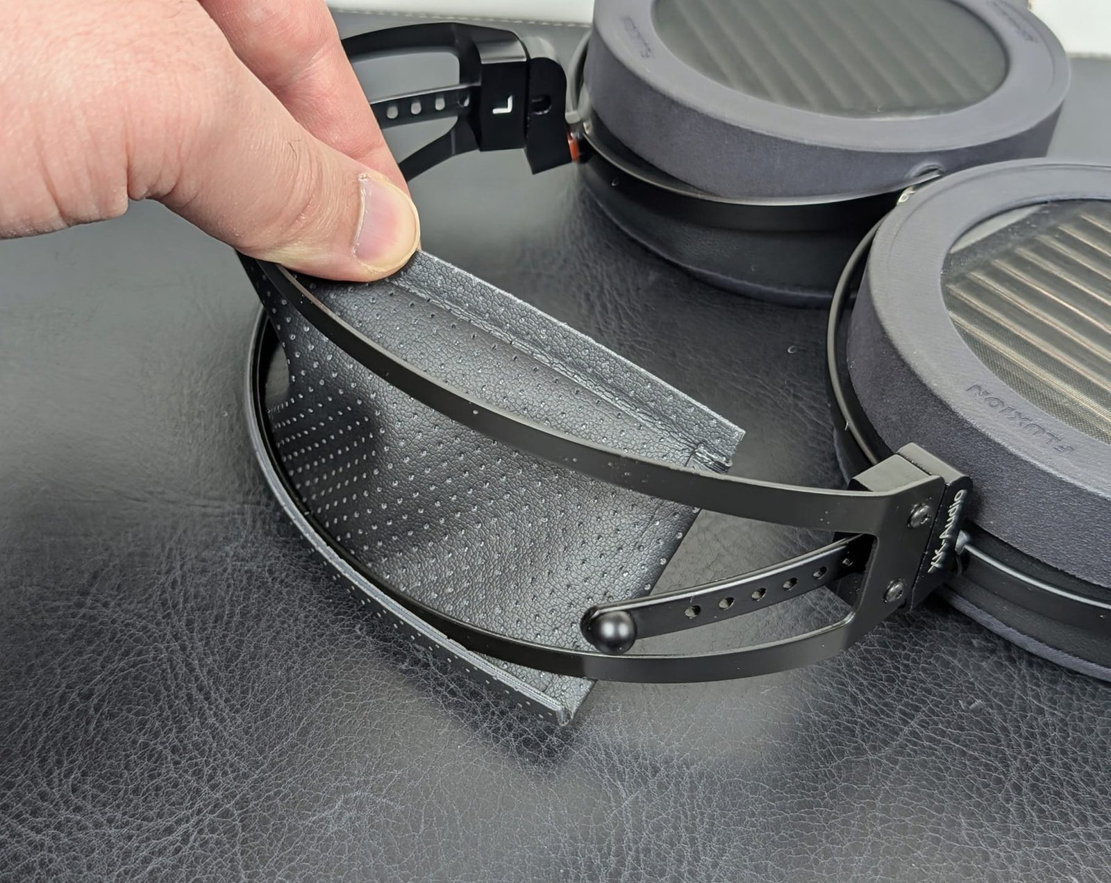 Kiinalaisten kauppiaiden valikoimasta löytyy irtotavarana ihan hyviä sankarakenteita, mutta jostakin syystä XK-Audio on päätynyt kehnoon ratkaisuun. Positiivisena puolena Fluxionin sanka on tehty kokonaan metallista, mutta harmillisesti liikkuvissa osissa ei ole minkäänlaista vastusta, vaan kupit pyörähtävät kuulokkeita käsitellessä oman tahtonsa mukaan ihan minne sattuu. Panta on Avalon mk2:n tapaan myös niin suuri, ettei minun tarvitse säätää sen korkeutta laisinkaan. Lisäksi olemattoman ohut pääpehmustekin on hämmentävä, koska päälaen korkeimman kohdan olisi tarkoitus mahtua kahden metallitangon väliin. Itselleni panta toimii joten-kuten, mutta olen silti lisännyt siihen pakkaukseen sisältyneen tarrakiinnitteisen lisäpehmusteen, joka auttaakin tasaamaan 480 gramman painon paremmin päälaelleni.