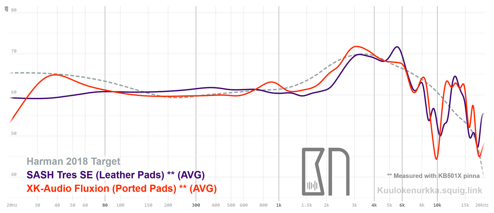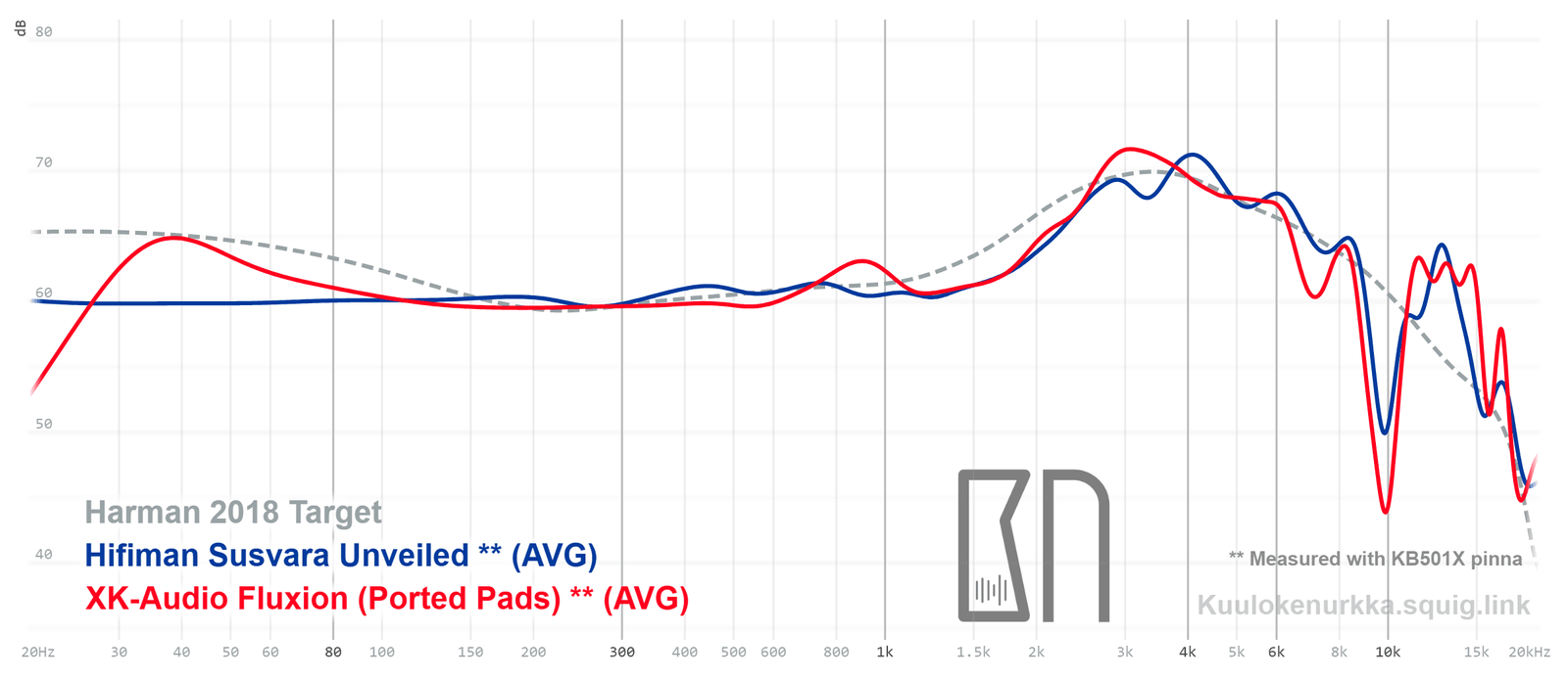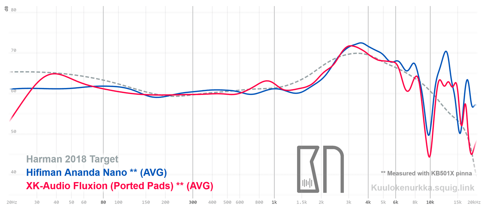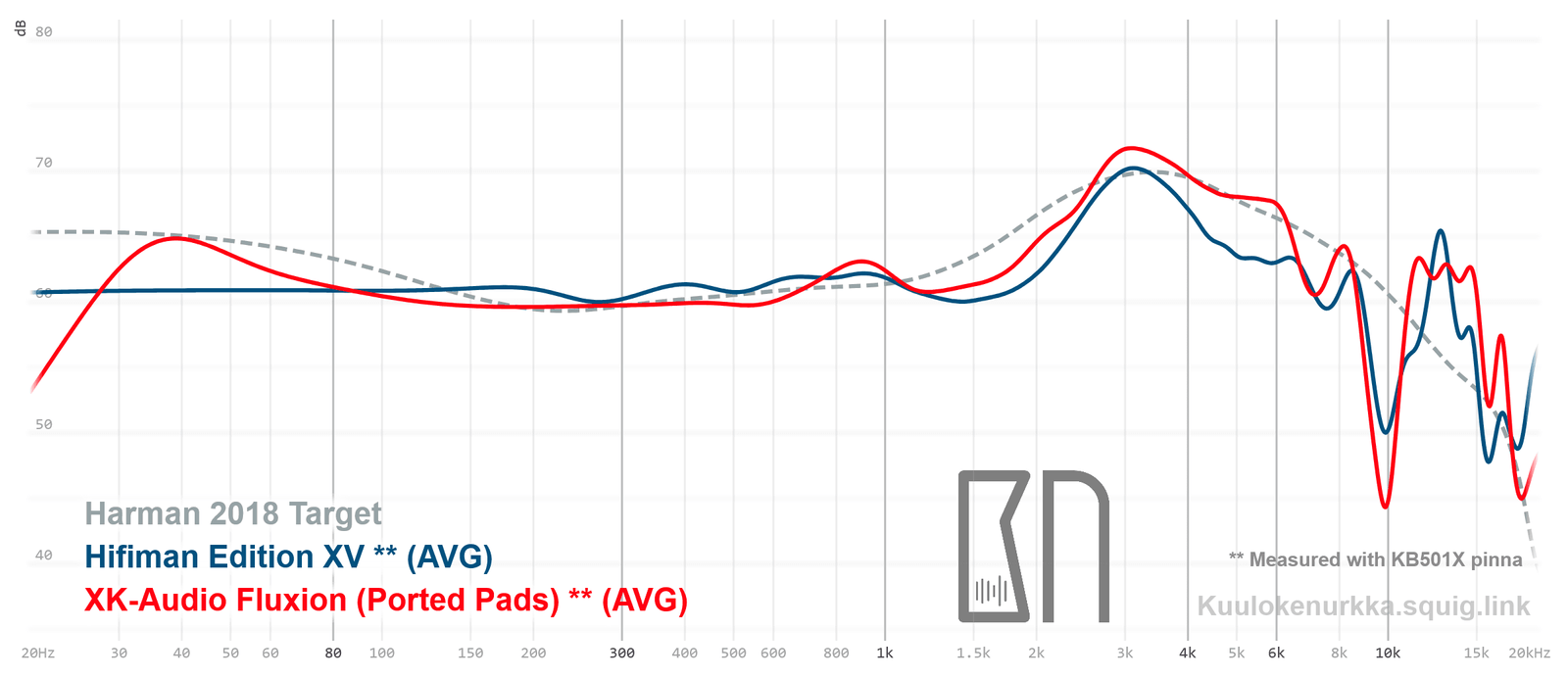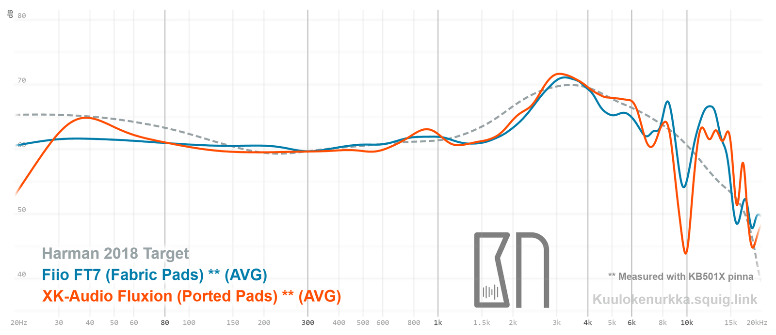 Kuulokkeiden taajuusvastemittaukset on tehty IEC711-standardin mukaisella laitteistolla ja KB501X-mallisilla silikonikorvilla. Kuvaajissa käytetään vertailupohjana tieteelliseen tutkimukseen pohjautuvaa Harmanin tavoitekäyrää (vuoden 2018 versio), joka on yleistys siitä, millaisen taajuusvasteen mukainen ääni kuulostaisi suurimman osan mielestä hyvältä ja vastaisi tasapainoisia kaiuttimia hyvin akustoidussa huoneessa. Lisätietoa mittauksista ja niiden tarkkuudesta löytyy Taajuusvastemittaukset-sivulta. Fluxionin taajuusvaste on myös vertailtavissa muiden mitattujen kuulokkeiden kanssa Squiglink-vertailutyökalun avulla.