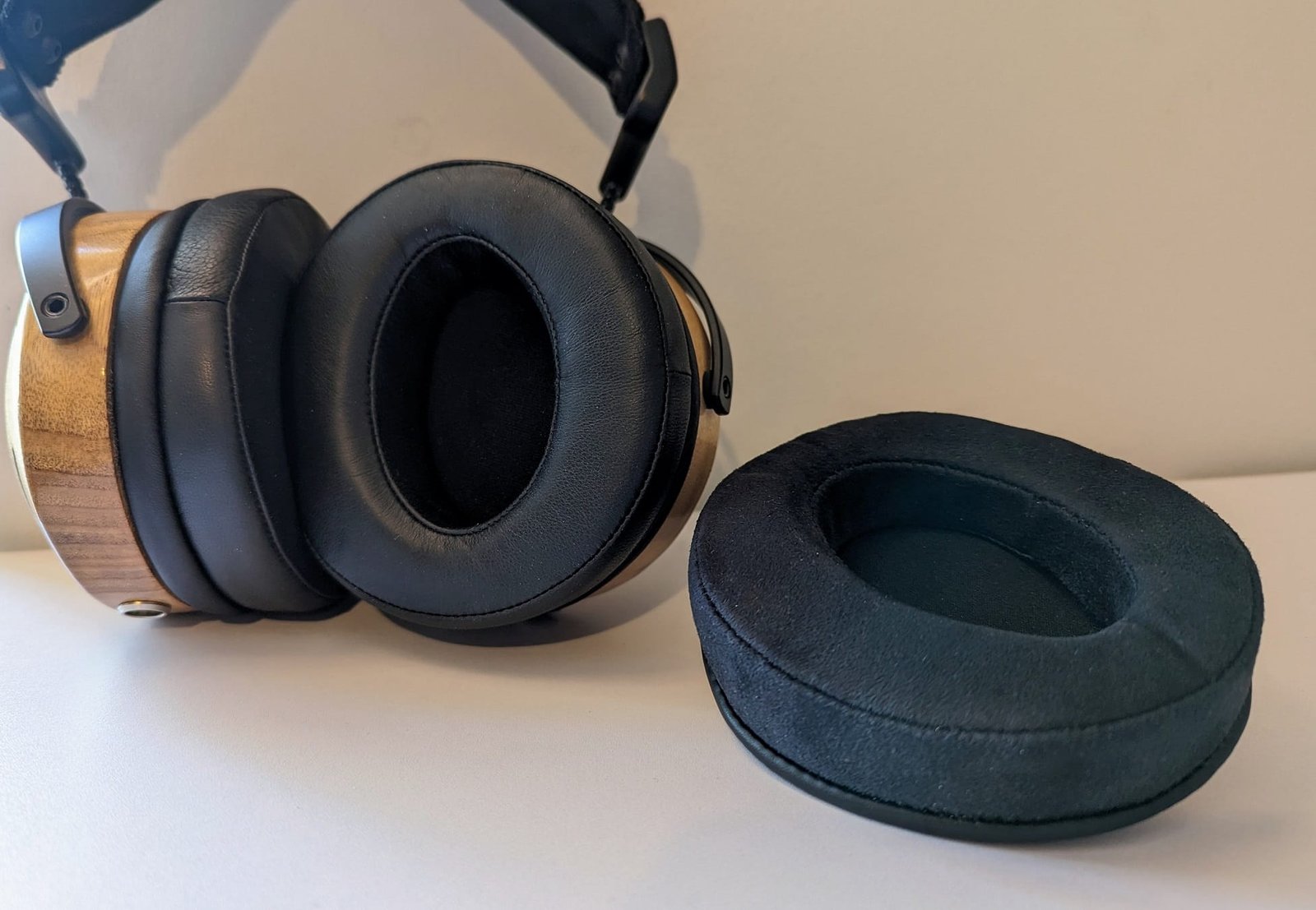 Eikon-pehmusteet ovat muodoltaan melko kallistetut, koska niiden takaosa on etuosaa paksumpi. Pehmustemallissa on ZMF:n mittapuulla kapeahko korva-aukko, mutta korkeus ja syvyys riittää hyvin suurillekin korville. Pehmusteiden osalta kuulokkeiden käyttömukavuus on erinomainen. Äänenlaadullisesti en osaa päättää, pidänkö enemmän pehmusteiden nahka- vai mokkaversiosta, joten käsittelen myöhemmin niitä molempia.