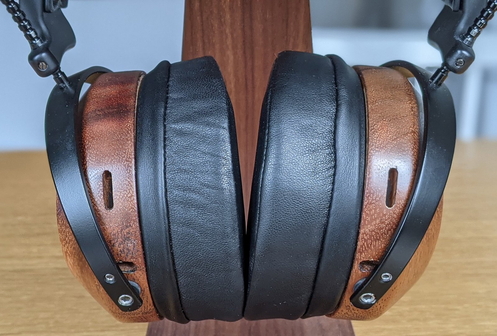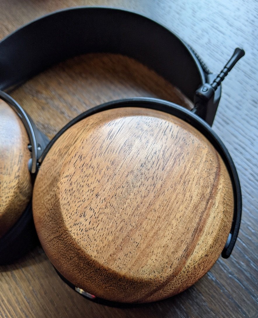 Omat kuulokkeeni on valmistettu pehmeästä monkeypod-puusta, joka oli vuoden 2021 kesään saakka ZMF:n peruspuulaatu Verite C -kuulokkeissa. Koska ostamieni B-stock kuulokkeiden tiedoissa luki ”sisältää puun työstöjälkiä/repeämiä”, olin etukäteen hieman huolissani kuppien ulkonäöstä. Lopputulos oli kuitenkin lähes täydellinen – mielestäni monkeypod on kauniin väristä ja vahattu pinta korostaa mukavasti puun huokoista rakennetta. Kupit ovat erittäin siistin näköiset, koska niissä on yhtenäinen tasainen pinta.