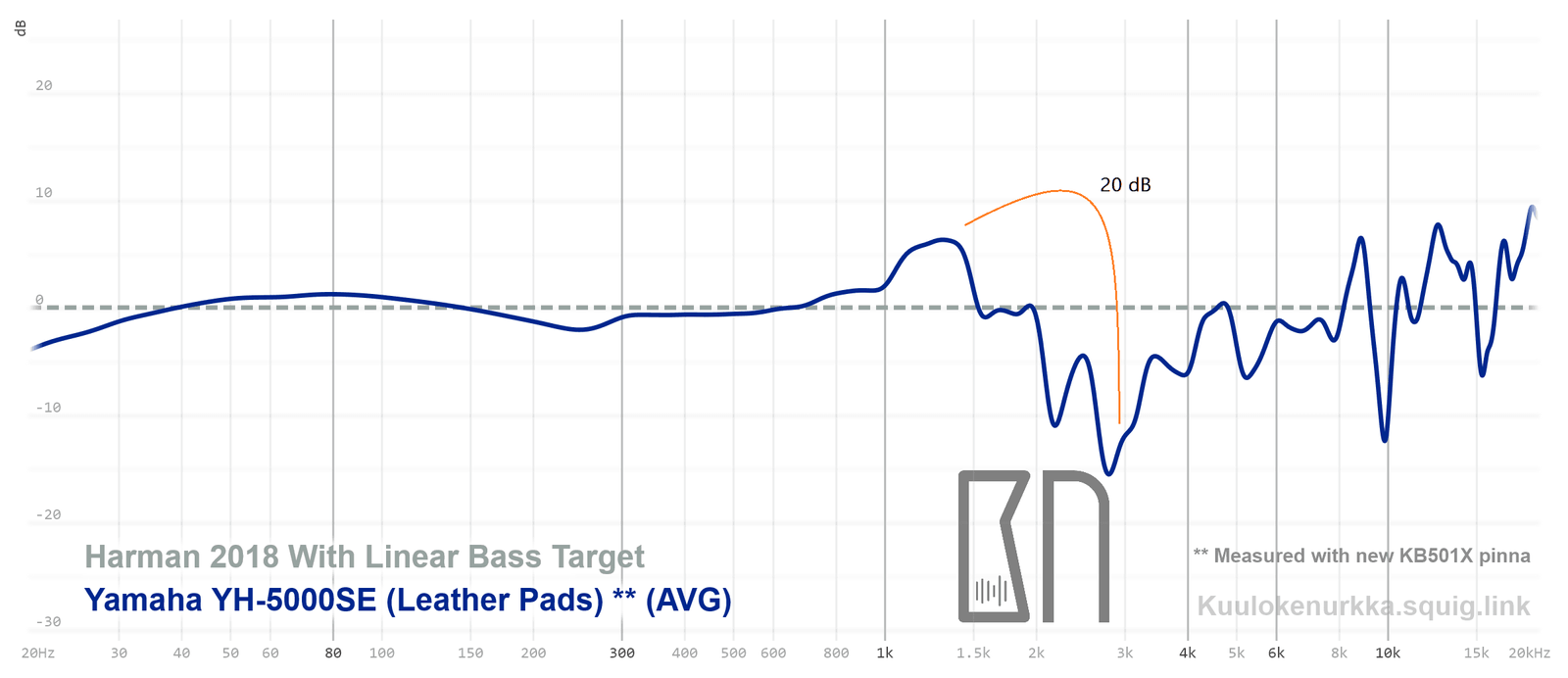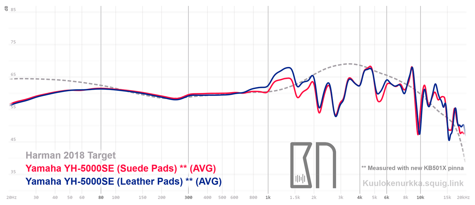Kuulokkeiden taajuusvastemittaukset on tehty IEC711-standardin mukaisella laitteistolla ja KB501X-tyylisillä silikonikorvilla. Kuvaajissa käytetään vertailupohjana tieteelliseen tutkimukseen pohjautuvaa Harmanin tavoitekäyrää (vuoden 2018 versio), joka on yleistys siitä, millaisen taajuusvasteen mukainen ääni kuulostaisi suurimman osan mielestä hyvältä ja vastaisi tasapainoisen kuuloisten kaiuttimien kuuntelua hyvin akustoidussa huoneessa. Lisätietoa mittauksista ja niiden tarkkuudesta löytyy Headphone Measurements-sivulta. YH-5000SE:n taajuusvaste on myös vertailtavissa muiden mitattujen kuulokkeiden kanssa Squiglink-vertailutyökalun avulla.