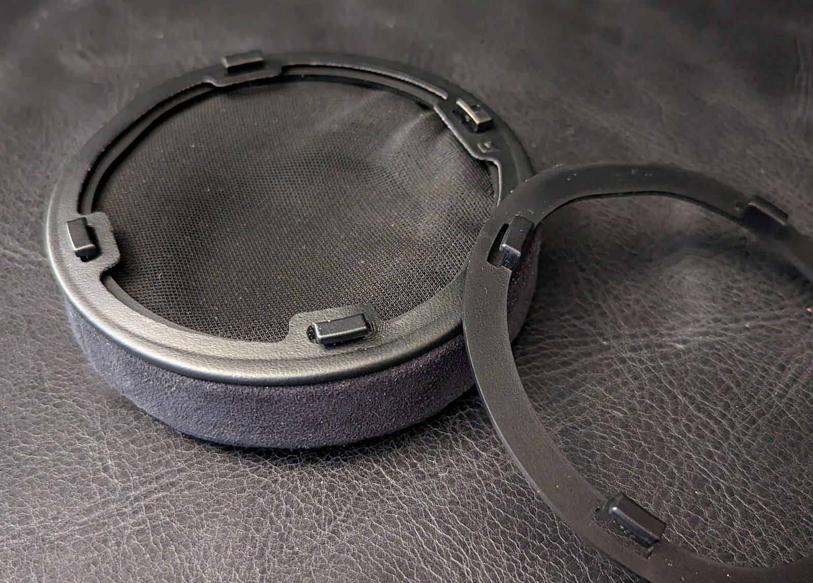 Toimintaperiaatteeltaan melko vastaavaa kiinnitysmenetelmää hyödynnetään myös Fostexin ja Denonin kuulokkeissa, joten japanilaiset valmistajat ottavat selvästi mallia toisistaan. Yamahan ratkaisu on kuitenkin mielestäni paras, koska pehmusteiden reunuksesta tulee kiinnityshakasten ympärille pienet lenkit, jotka pitävät käyttöasennon aina oikeana. Tämä onkin melko olennaista, koska YH-5000SE:n pehmusteet ovat edestä ja takaa eri paksuiset, eikä korva-aukkokaan ole pyöreä. Kuulokkeissa voidaan toki edelleen kokeilla myös muita pehmusteita, kunhan niiden reunukseen tehdään hakasten läpivientiä varten pienet reiät.