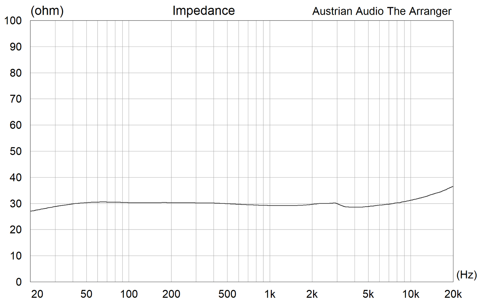 Austrian Audio kertoo kuulokkeidensa nimellisimpedanssiksi 25 ohmia, mutta itse mittasin noin 30 ohmin lukeman. Eipä näin pienellä erolla sinällään väliä ole, vaan kiinnittäisin enemmän huomiota impedanssikäyrän tasaisuuteen, mikä ei ole laisinkaan tavallista dynaamisten elementtien kohdalla. Tämän ansiosta Arrangeria on ”turvallista” kuunnella myös korkeamman lähtöimpedanssin omaavalla vahvistimella, koska taajuusvaste pysyy aina suunnitellun kaltaisena. Esimerkiksi monien studioiden laitteisto lienee yhä melko iäkästä, mutta siitä ei olisi tässä tapauksessa merkittävää haittaa.
