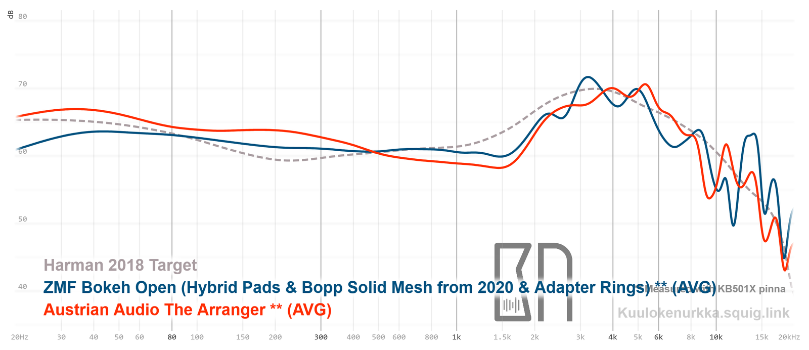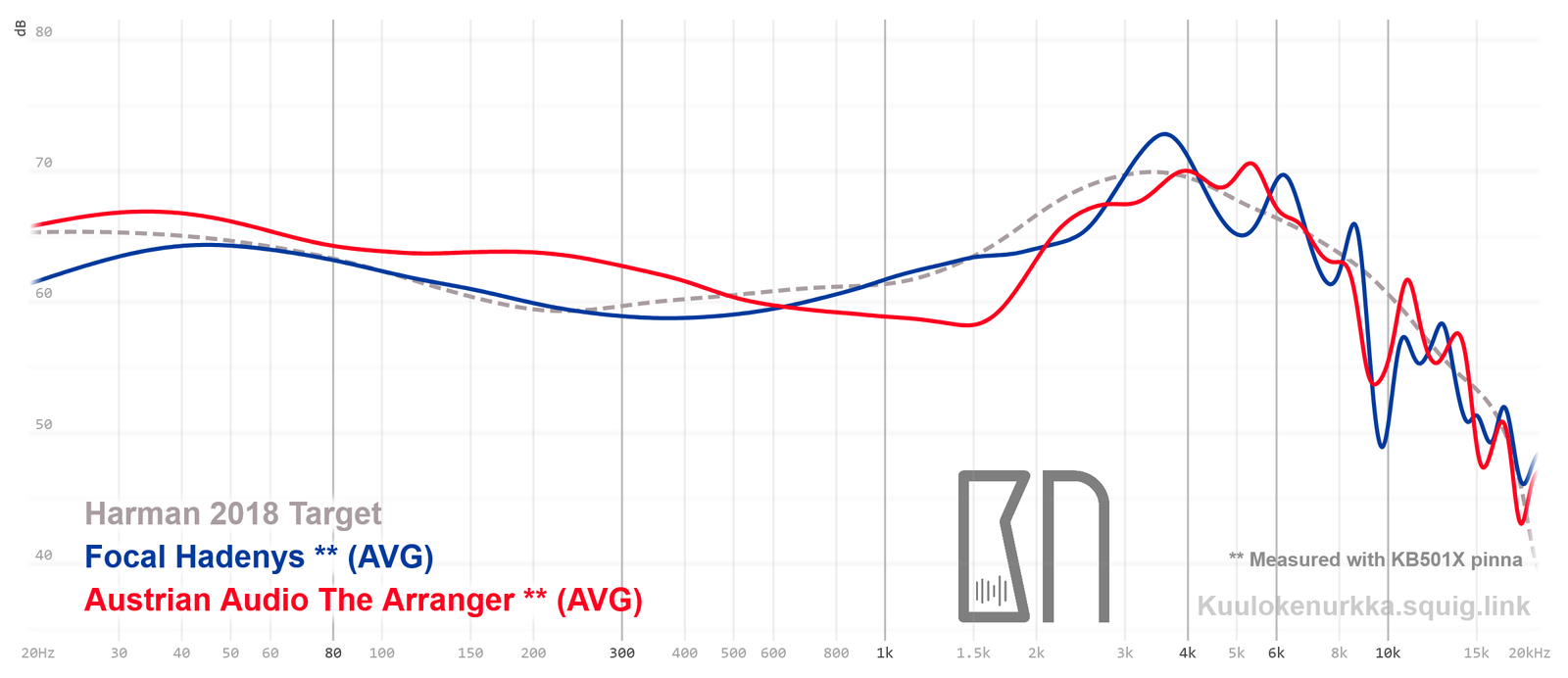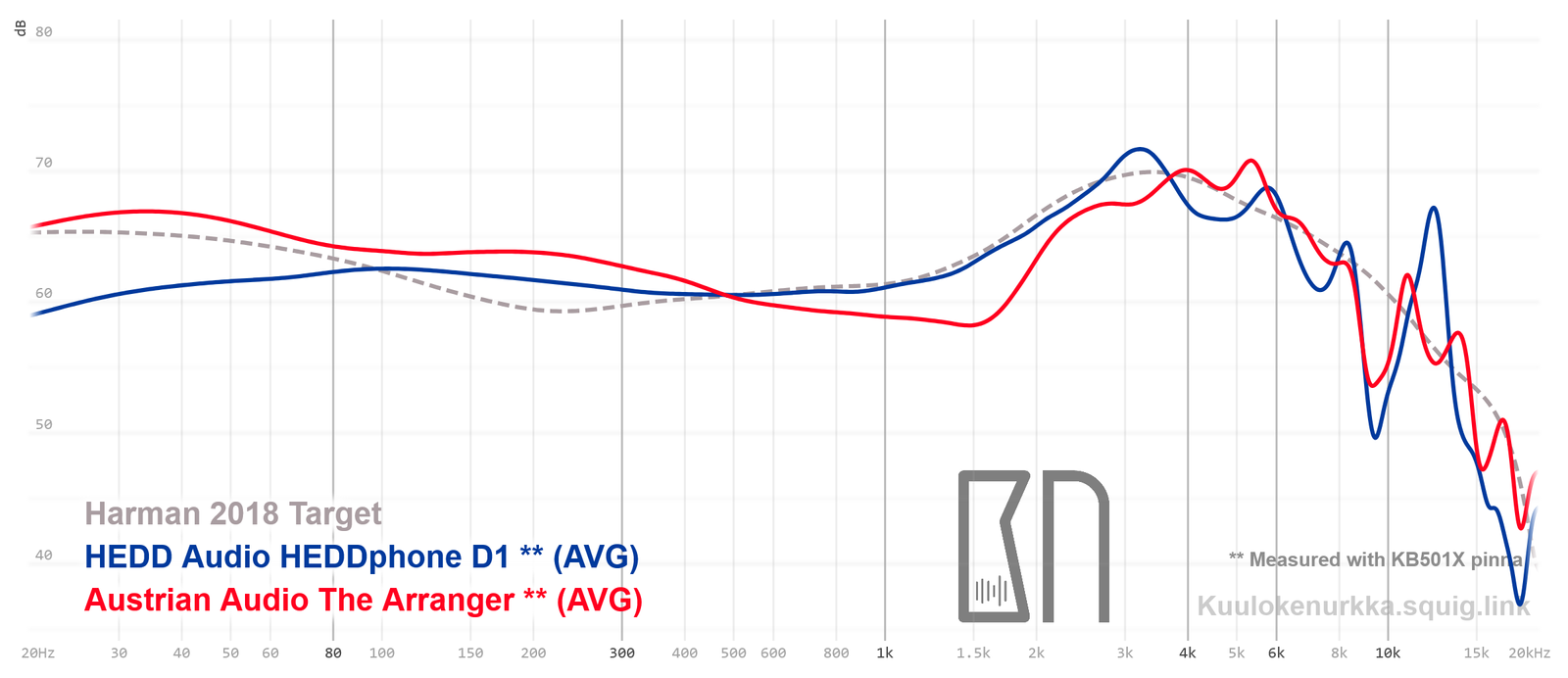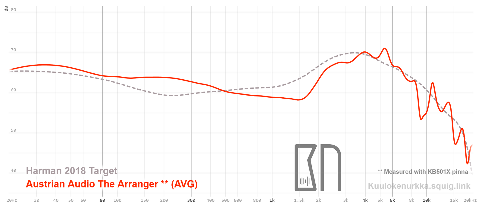 Our frequency response measurements have been made with a clone IEC-60318-4 coupler and KB501X pinnae. The Harman target curve from 2018 is used as a reference point and generalization of the headphone response that would sound good to most people. For more information on the measurements and their accuracy, see Headphone Measurements-sivulta. The Arrangerin taajuusvaste on myös vertailtavissa muiden mitattujen kuulokkeiden kanssa Squiglink avulla.
