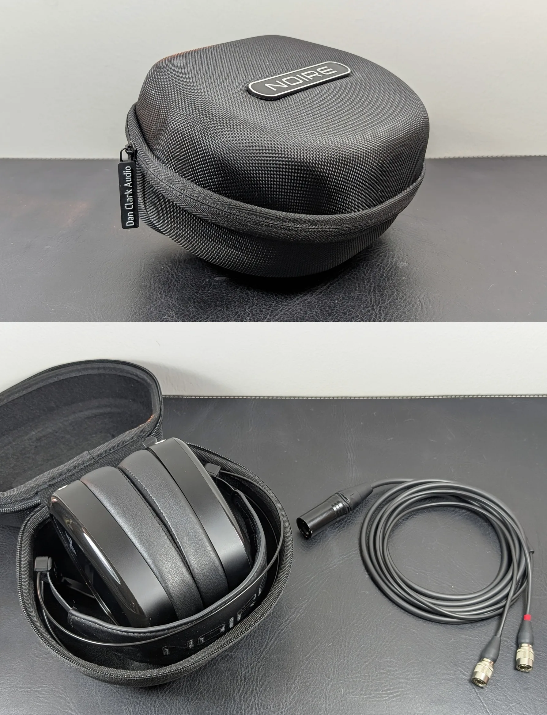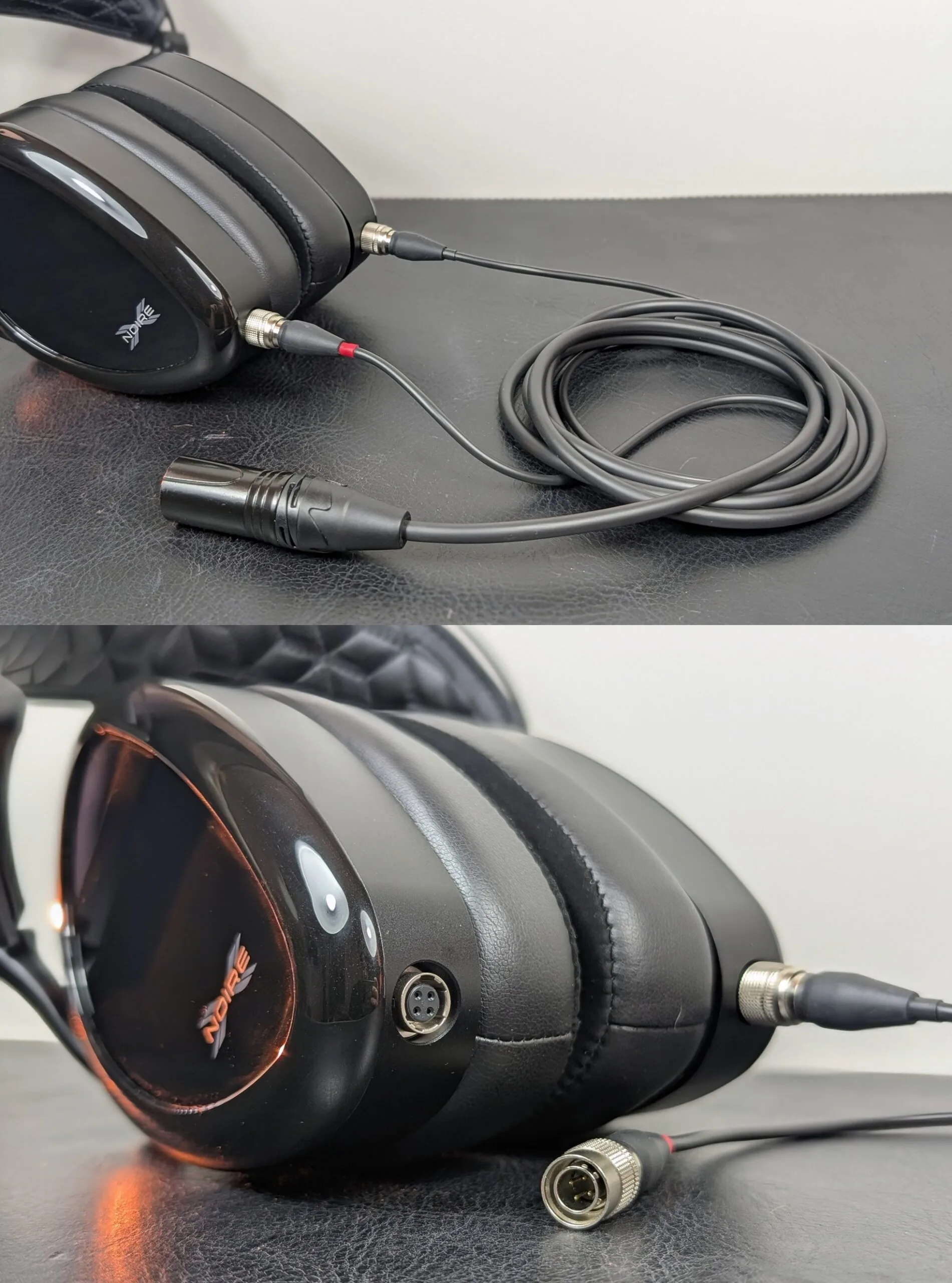 Kuulokekuppeihin kaapeli kiinnittyy tuttuun tapaan lukittuvilla Hirose-liittimillä, joihin ei edelleenkään törmää muiden valmistajien kuulokkeissa. Dan Clark Audio onkin jo pidemmän aikaa onnistunut pysyttelemään uniikkina niin hyvässä kuin pahassa. Liittimet herättävät kestävyydellään luottamusta, mutta lisäkaapeleita ei ole saatavilla aivan yhtä laajalti kuin vaikkapa 3,5 millimetrin liittimillä varustettuna. Noire X:ssä naarasliittimet on mielenkiintoisesti jälleen upotettu kuppien sisään, kun taas E3:ssa ne törröttävät enemmän esillä.