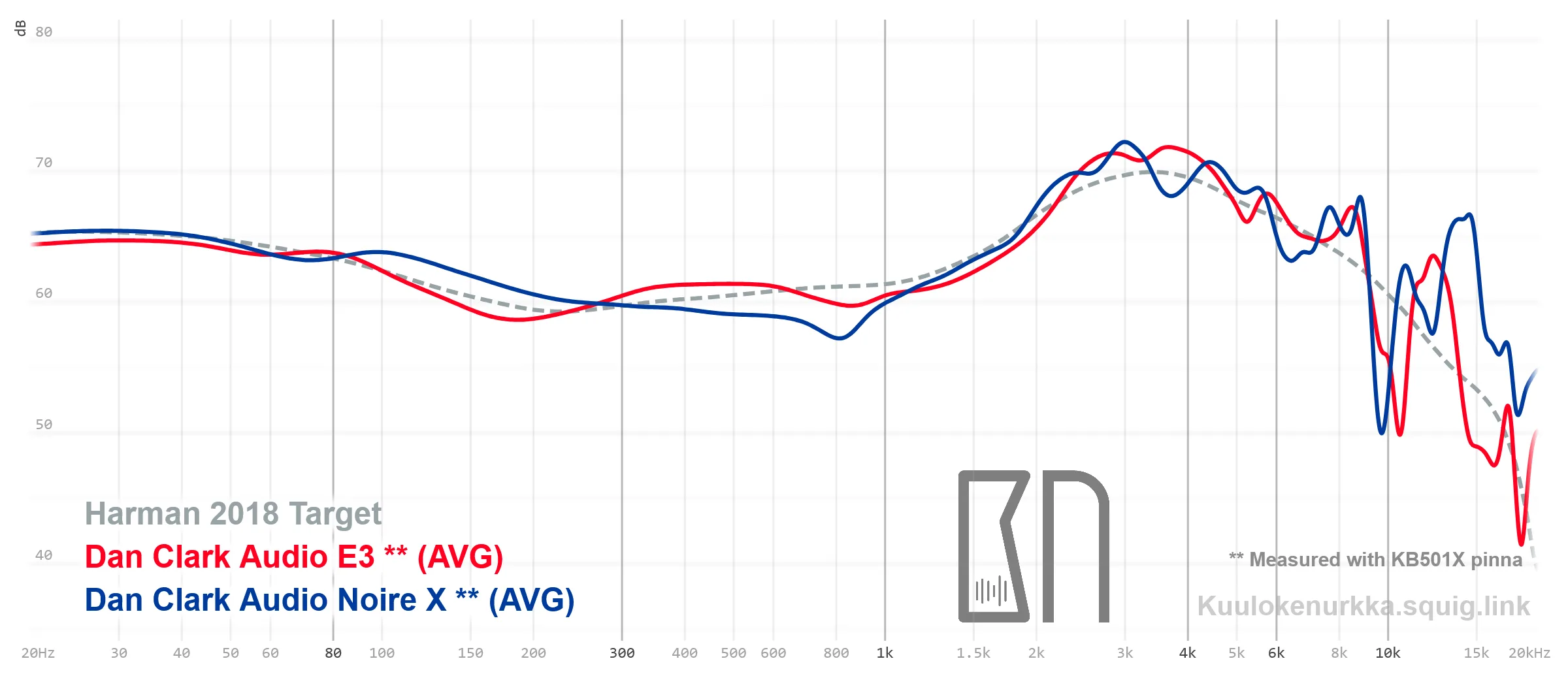Dan Clark Audio sanoo tuunanneensa kuulokkeet B&K 5128 -mittauslaitteistolla, johon ei suoraan voida soveltaa Harmanin käyrää, vaan Diffuse Field -vasteesta johdettua mukaelmaa. Kannattaa siis huomioida, ettei Noire X:n taajuusvasteen lähtökohtaisesti tulisi osua täydellisesti Harman 2018 -käyrälle omalla laitteistollani mitattuna, vaikka kuulokkeet selvästi Harman-inspiroituneet ovatkin. Jos aivan tarkkoja ollaan, Harmanin käyrä on muutoin hieman epämääräinen ja liukuva käsite, koska mikään nykylaitteista ei vastaa täysin Harman-tutkimuksessa käytettyä kokoonpanoa etenkään silikonikorvien osalta. Tämä kaikki huomioiden Noire X:n taajuustasapaino on hyvin kohdallaan, kuten Dan Clark Audiolta nykyään sopii odottaa.