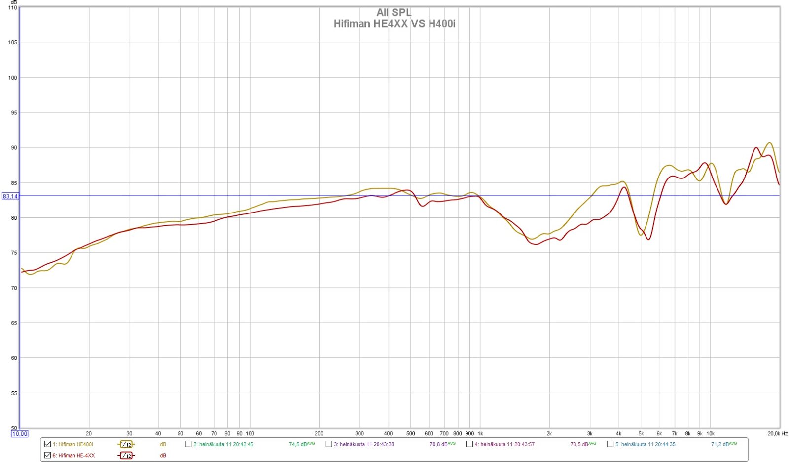 Kun mittasin kuulokkeiden taajuusvasteen, luulin nimenneeni HE400i:n mittaukset vahingossa HE4XX:n mittauksiksi. Näin ei kuitenkaan käynyt, vaan kuulokkeet mittautuvat taajusvasteltaan lähes identtisesti. Kuuntelemalla en yrittämälläkään löytänyt mitään eroa kahden mallin välillä. Mittauksissa näkyvät erot selittyvät todennäköisesti kuulokkeiden hieman erilaisella asennolla mittauslaitteessa sekä hieman toisistaan eroavilla pehmusteilla.