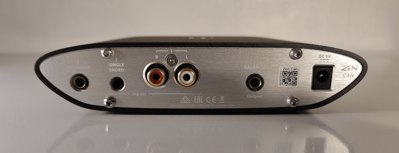 Muina sisääntuloina laitteen takaa löytyy luonnollisesti perinteiset RCA-liitännät sekä 3,5 mm:n AUX-liitäntä, joka on kätevä, jos Zen CAN:illa halutaan parantaa esimerkiksi tietokoneen äänenlaatua ilman erillistä D/A-muunninta. Vahvistimessa on lisäksi 4.4 mm:n balansoitu ulostulo, joka mahdollistaa sen käyttämisen esivahvistimena. Virtaa laite saa 5 voltin virtalähteellä, joka kiinnittyy reunassa sijaitsevaan liittimeen. Toisin kuin Zen DAC:ia, Zen CAN:ia ei voida käyttää pelkällä USB-virralla.