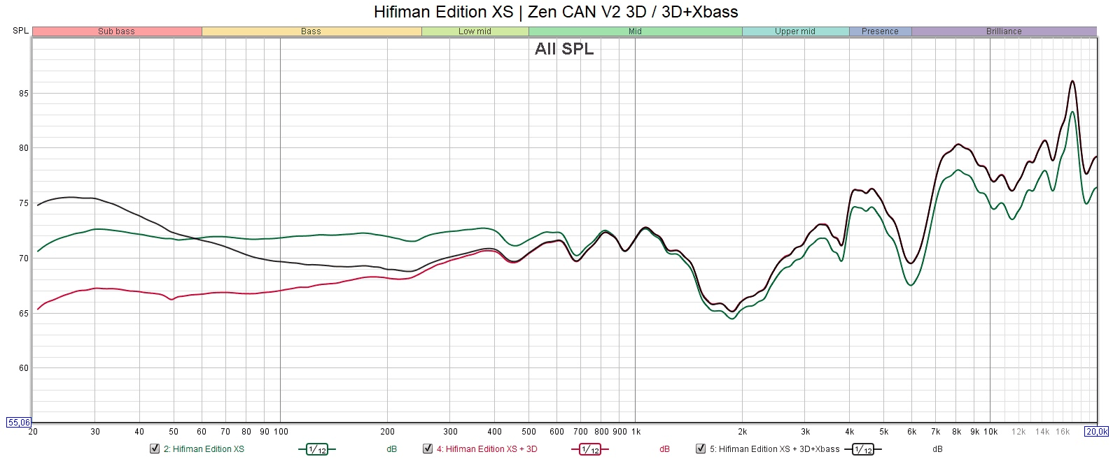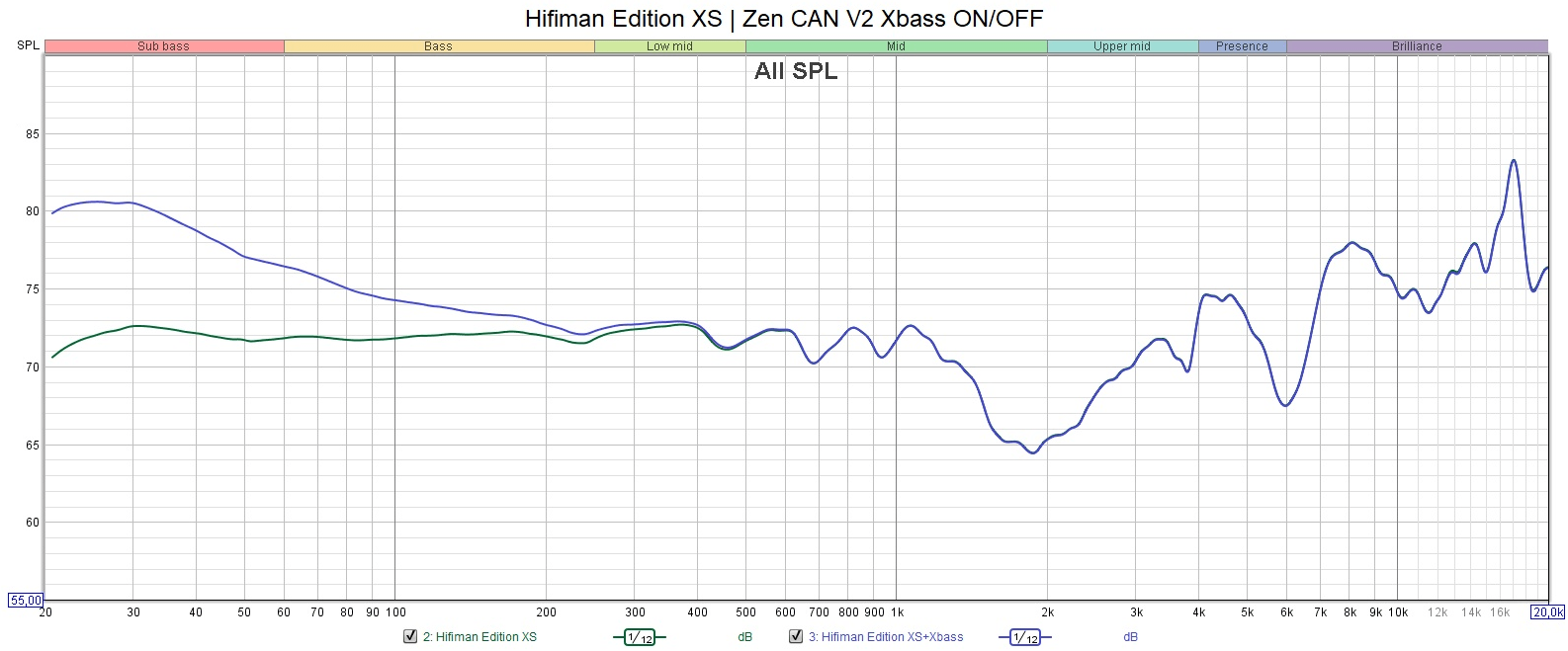 Laitteesta löytyvä XBass-asetus korostaa bassoa enimmillään lähes 8 desibeliä, mikä on monille kuulokkeille aivan liikaa. Bassokorostus alkaa jo alemman keskialueen rajalta, mistä se voimistuu pikkuhiljaa saavuttaen huippunsa 30 Hz:n tuntumassa. Ominaisuus olisi hyödyllisempi, jos sen vaikutus olisi rajattu 100 Hz:n alapuolelle, koska vain harvoilla kuulokkeilla on ongelmia keskibasson toistamisessa. Kaikesta huolimatta asetuksen käyttäminen on kuitenkin toisinaan hauskaa. XBass on mielestäni lisäominaisuutena huomattavasti hyödyllisempi kuin esimerkiksi monien D/A-muuntimien äänifiltterit, jotka eivät käytännössä muuta ääntä juuri ollenkaan.