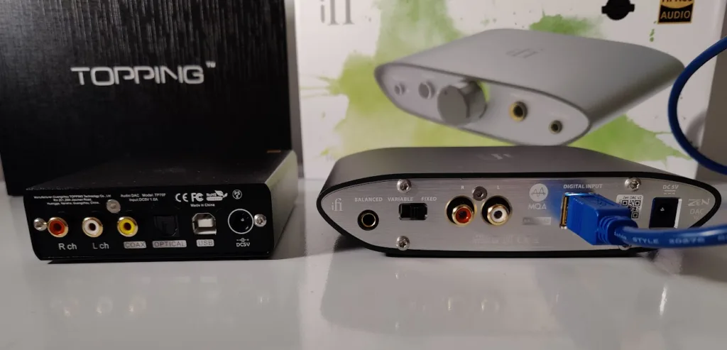 - Toppingissa on USB-sisääntulon lisäksi optinen ja koaksiaalinen liitäntä, muttei balansoitua ulostuloa, kuten iFi:ssä