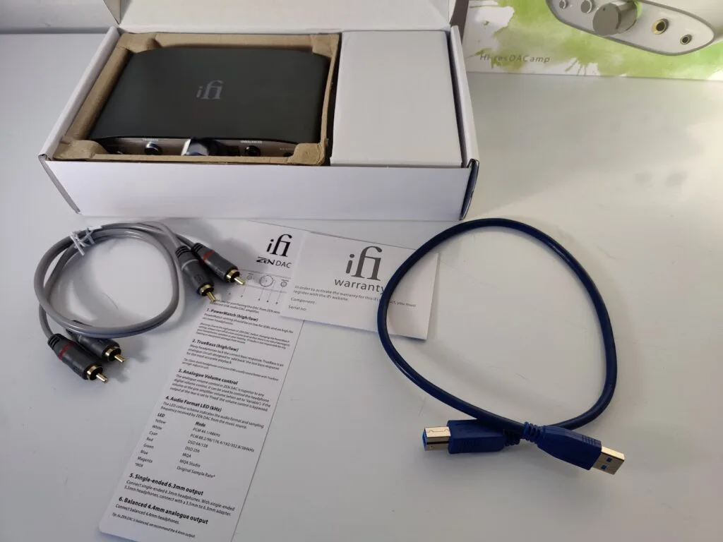 Zen DAC V2:n mukana toimitetaan RCA-kaapelit, USB-B 3.0 -kaapeli ja 3,5 mm:n liittimen 6,35 mm:n liittimeksi muuntava adapteri. Erillistä virtalähdettä laitteen mukana ei tule, joten se on joko hankittava erikseen tai tyydyttävä USB-liitännän tarjoamaan virtaan. On itseasiassa varsin kätevää, ettei laitetta tarvitse kytkeä erikseen pistorasiaan.