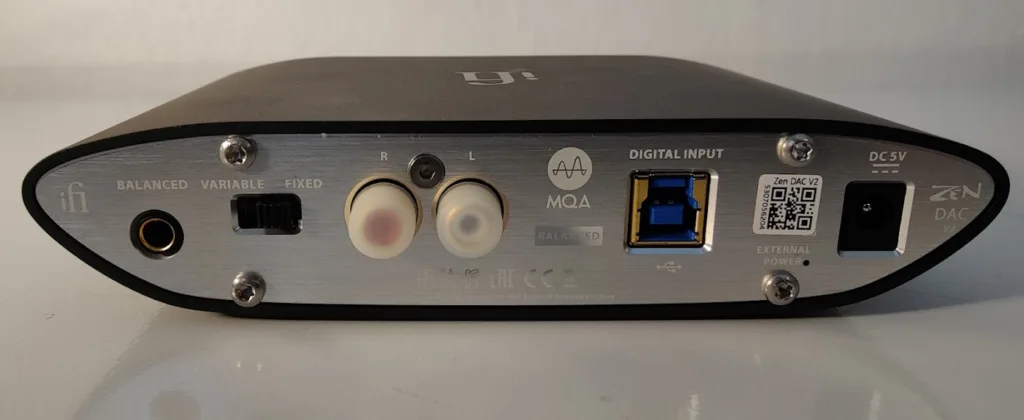 Zen DAC:in takapuolella on perinteiset RCA-ulostulot, hieman poikkeuksellisempi 4,4 mm:n balansoitu ulostulo sekä USB-sisäänmeno, jonka kautta laite voi ottaa myös virtansa. Verkkovirralla käyttämistä varten on erillinen 5 voltin virtaliitäntä. Valitettavasti erillistä virtalähdettä tai kaapelia Zen DAC:in mukana ei kuitenkaan toimiteta.