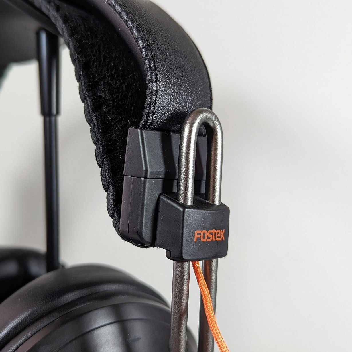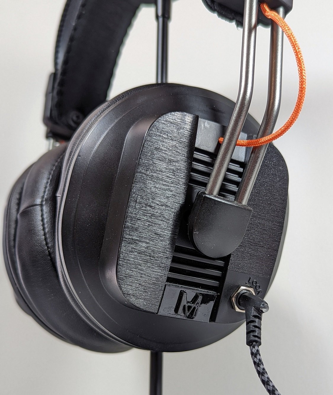Kuppien välillä kulkee pääpannan läpi myös oranssi yhteyskaapeli, sillä varsinainen kuulokekaapeli kiinnittyy vain toiseen kuppiin. Hieman poikkeuksellisesti vasemman kupin sivussa sijaitseva 3,5 mm:n liitin on Fostexin kuulokkeissa lukittuvaa mallia, mutta Mod House Audio on korvannut sen tavallisella liittimellä, johon sopii mikä tahansa 3,5 mm:n liittimellä varustettu kaapeli. Argon-mallin mukana tulee oletuksena vain Fostexin alkuperäiset vakiokaapelit. Olen itse käyttänyt kuulokkeissa V-Modan reilu 10 euroa maksavaa kangaspäällysteistä kaapelia (ei välttämättä enää myynnissä).