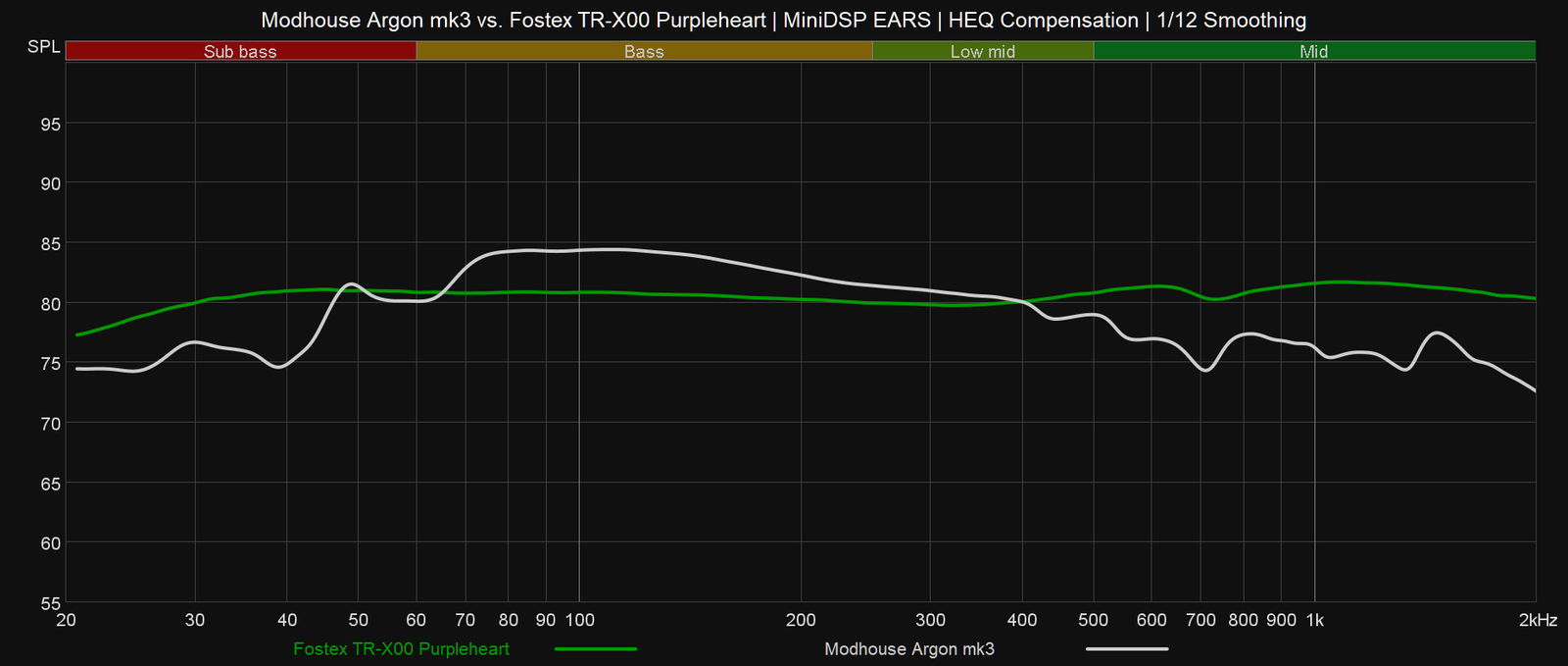 Modhouse Argonin bassontoisto (valkoinen) verrattuna dynaamisella bioselluloosaelementillä varustettuun Fostex TR-X00 Purpleheart -malliin (vihreä). TR-X00:n lineaarisempi bassontoisto soveltuu paremmin elektroniseen musiikkiin, kun taas Argon on hauskempi ja muhkeampi esimerkiksi eri rock- ja hevigenreissä.