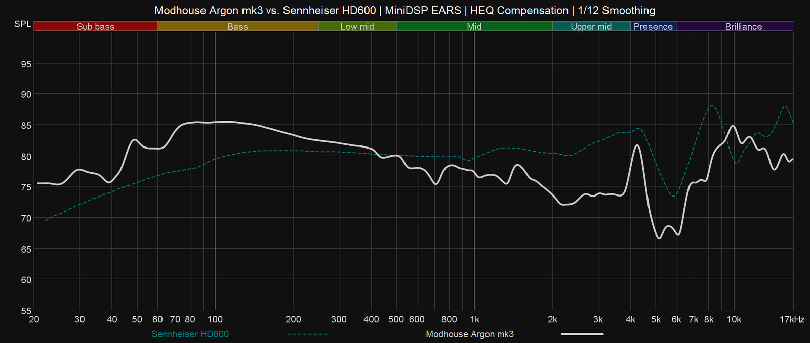 Modhouse Argonin taajuusvaste (valkoinen) verrattuna neutraalina pidettyyn Sennheiser HD600-malliin (turkoosi katkoviiva). Argonin bassontoisto on pitkälti riippuvaista pehmusteiden sulkevuudesta, joten alabassojen mittaustarkkuus on itselleni täysin kysymysmerkki. Myös 5–7 kHz:n taajuusalue on epätarkka ja notkolla molemmissa kuulokkeissa, sillä MiniDSP EARS ei osaa mitata sitä tarkasti.