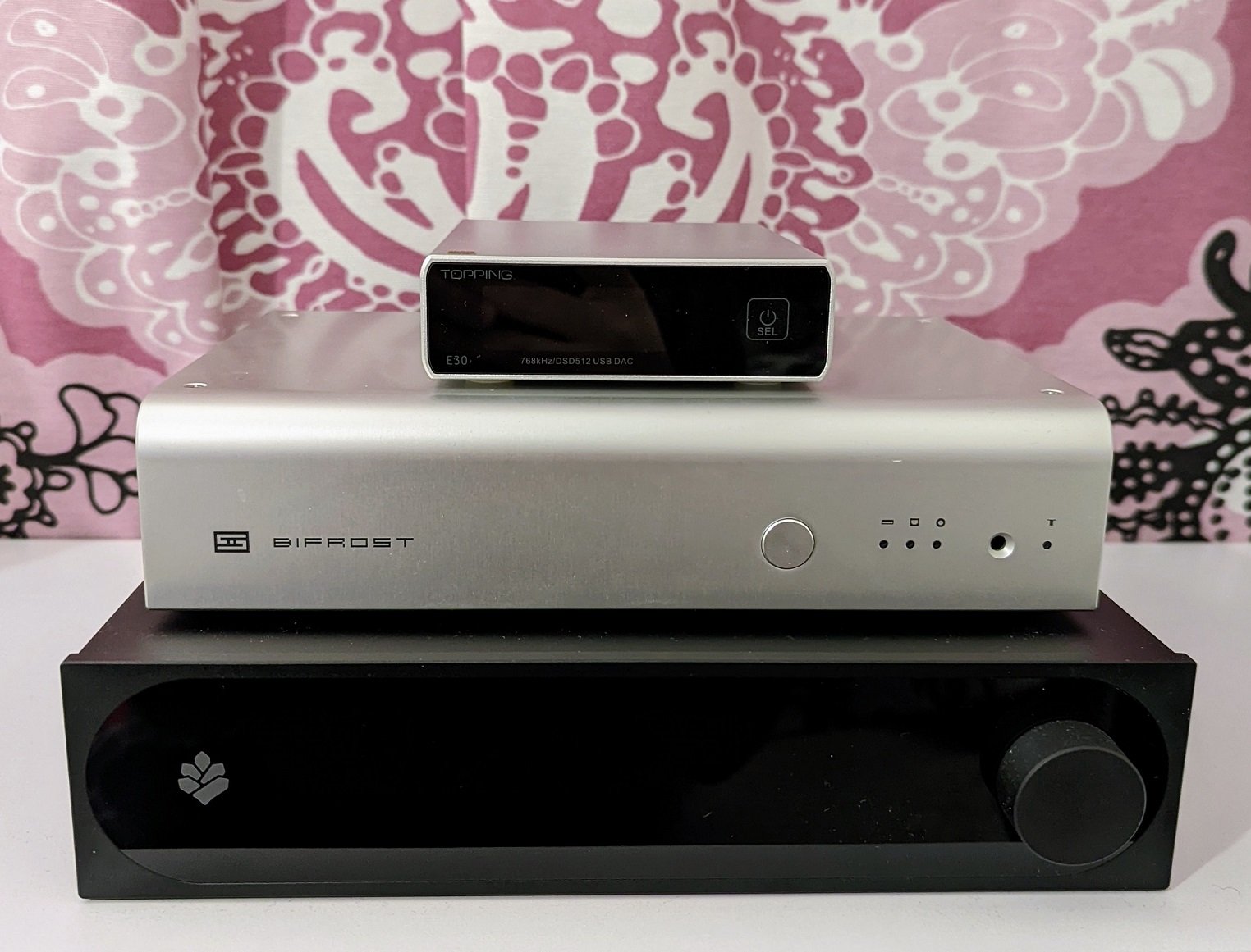Kokeilin ensimmäisenä halvempaa AKM-piiriin pohjautuvaa Topping E30:tä, jota pidän mainiona perus-DAC:ina. Pidän erityisesti sen ominaisuudesta sammuttaa ja käynnistää itsensä automaattisesti vastaanotetun äänisignaalin perusteella.