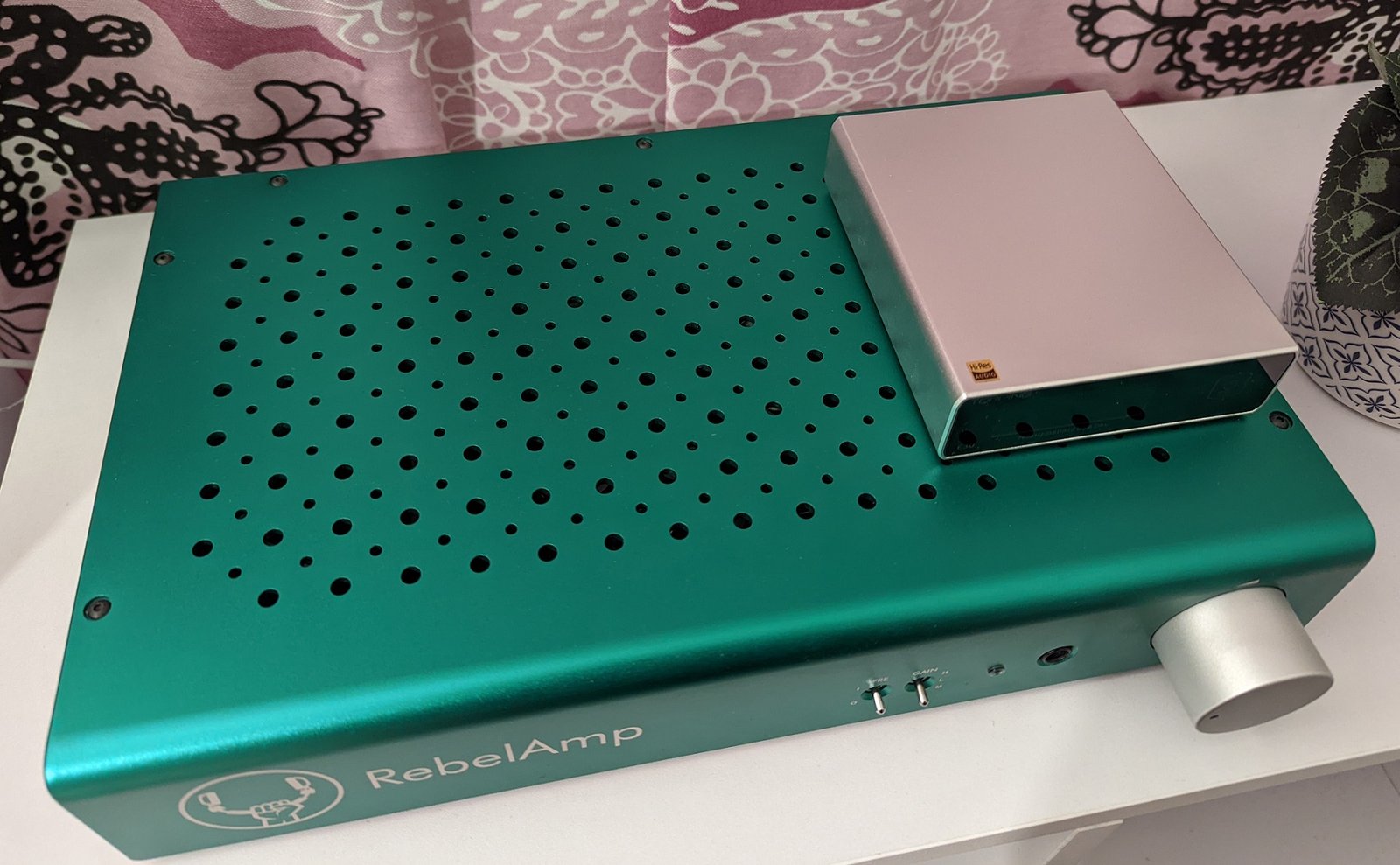 RebelAmp on kooltaan massiivinen, joten sitä on vaikeaa pinota siististi päällekkäin minkään muun laitteen kanssa. Koska laite lämpenee pidemmässäkin käytössä vain maltillisesti, olen monesti pitänyt sen päällä toisessa reunassa pienempää laitetta, kuten DAC:ia. RebelAmpin ulkokuori on anidisoitua alumiinia, ja rakenne on lähes identtinen kopio yhdysvaltalaisen Schiit Audion laitteista. Vihreä väritys jakaa varmasti mielipiteitä, mutta se näyttää onneksi todellisuudessa hienommalta kuin kuvissa. Laitteen nimestä ei jää epäselvyyttä, koska se on kirjoitettu vasempaan etureunaan kissan kokoisin kirjaimin. Rebel Audion logo muistuttaa joko sattumalta tai tarkoituksella ylösalaisin käännettyä HeadAmp:in logoa.