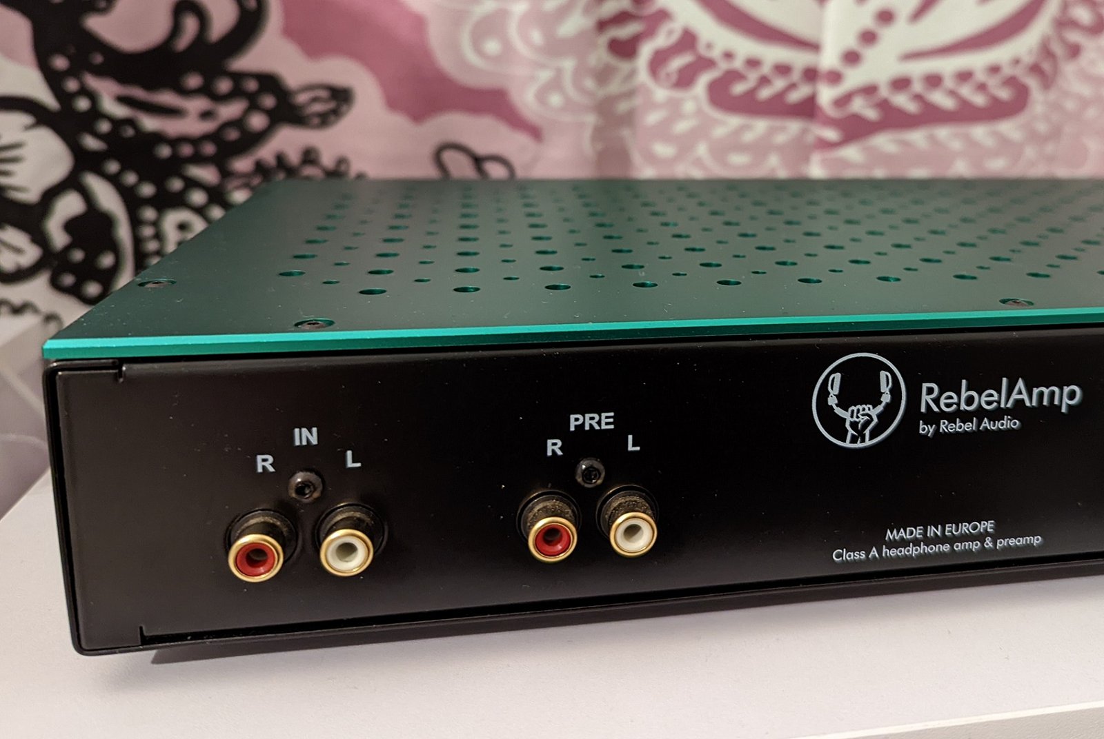 Vahvistimen takapuolella vasemmassa reunassa on RCA-sisääntuloliittimet ja toiset RCA-liittimet vahvistimen käyttämiseksi esivahvistimena. Huvittavana yksityiskohtana valmistaja kertoo vahvistimen olevan tehty Euroopassa. Tämä on tavallaan täysin totta, mutta hyvin harva muu Euroopassa sijaitseva valtio piiloutuisi Eurooppa-termin taakse ilmoittamatta tuotteen oikeaa valmistusmaata. Ukraina ei myöskään kuulu EU:n veroalueeseen, joten vahvistimesta joutuu maksamaan arvonlisäveron – tästä ei tule ainakaan itselleni kovinkaan eurooppalaista fiilistä, mutta esimerkiksi amerikkalaisille Eurooppa herättänee enemmän luottamusta kuin Ukraina.