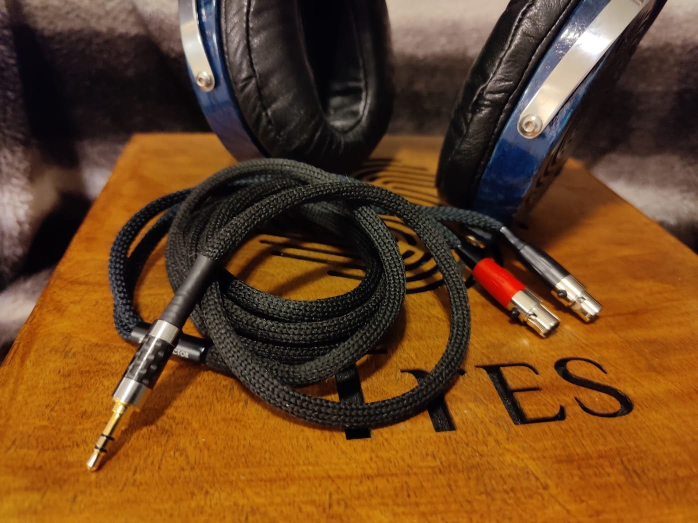 Tres:in kaapeli kiinnittyy kuppeihin kahdella 4-pinnisellä mini-XLR-liittimellä, joten kuulokkeissa voidaan käyttää esimerkiksi Audezen ja ZMF:n kaapeleita. SASH antaa ostajan valita kaapelin vahvistimeen kiinnittyvän liittimen. Vaihtoehtoina on tarjolla ainakin XLR, 6,35 mm ja 3,5 mm, joiden lisäksi olettaisin myös 4,4 mm:n liittimen olevan saatavilla. Omiin kuulokkeisiini valitsin 3,5 mm:n liittimen, koska itselläni ei ollut entuudestaan vastaavan tyyppistä kaapelia kyseisellä liittimellä. Tarkoituksenani oli joka tapauksessa käyttää kuulokkeissa jotakin muuta kuin Tres:in omaa kaapelia.