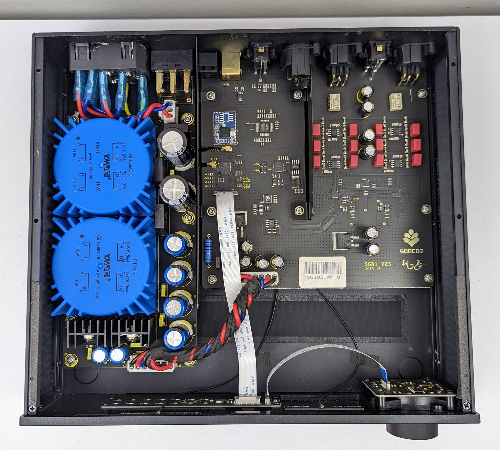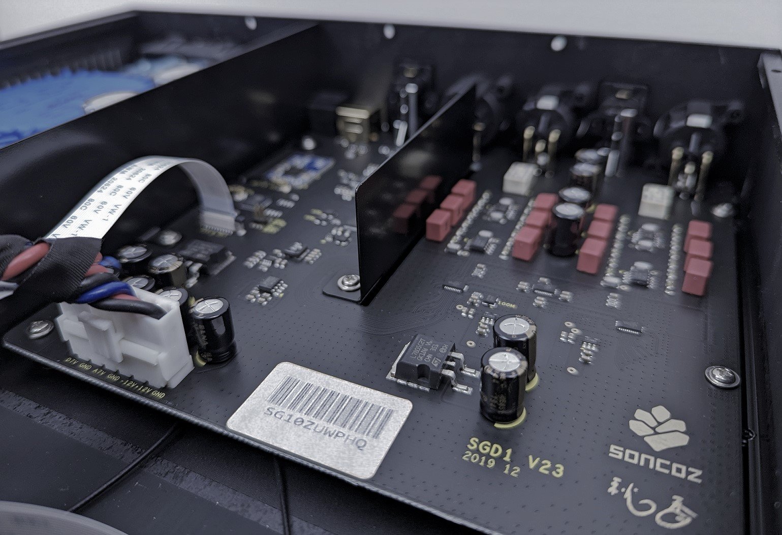 Itselläni ei ole suurempaa sähköteknistä ymmärrystä laitteiden komponenteista, mutta SGD1 näyttää omiin silmiini sisältä todella tarkkaan harkitulta ja vaikuttavalta kokonaisuudelta. Laitteen sisällä on muun muassa kaksi lineaarista virtalähdettä, mikä on melko ennenkuulumatonta 500 euron DAC:ille. Myös piirilevyn eri osiot on eristetty toisistaan. Koska SGD1 ei sisällä ulkoista antennia, sen ei välttämättä arvaisi sisältävän myös bluetooth-yhteyden sekä WIFI:n, jota käytetään tosin vain firmwaren päivittämiseen.