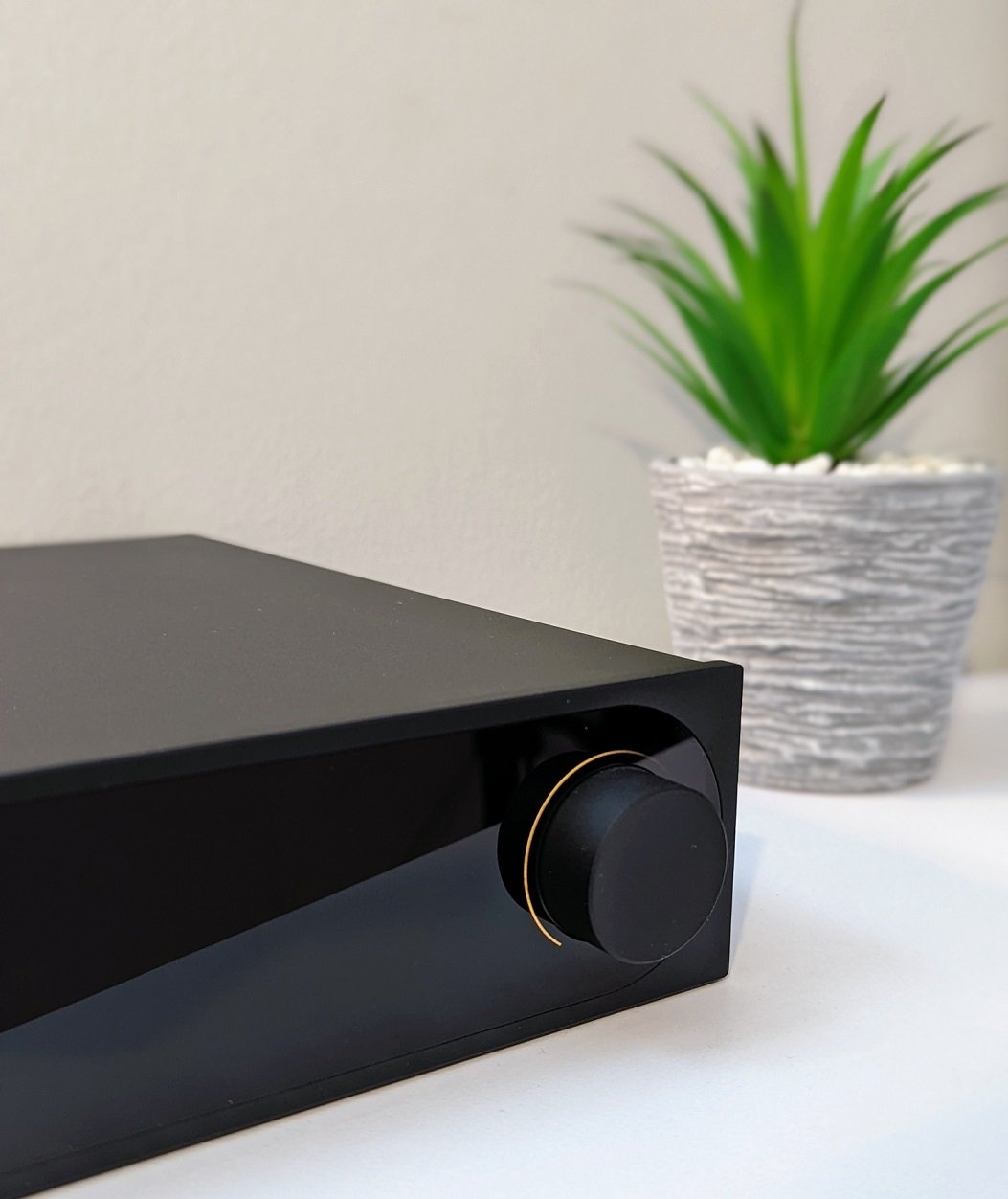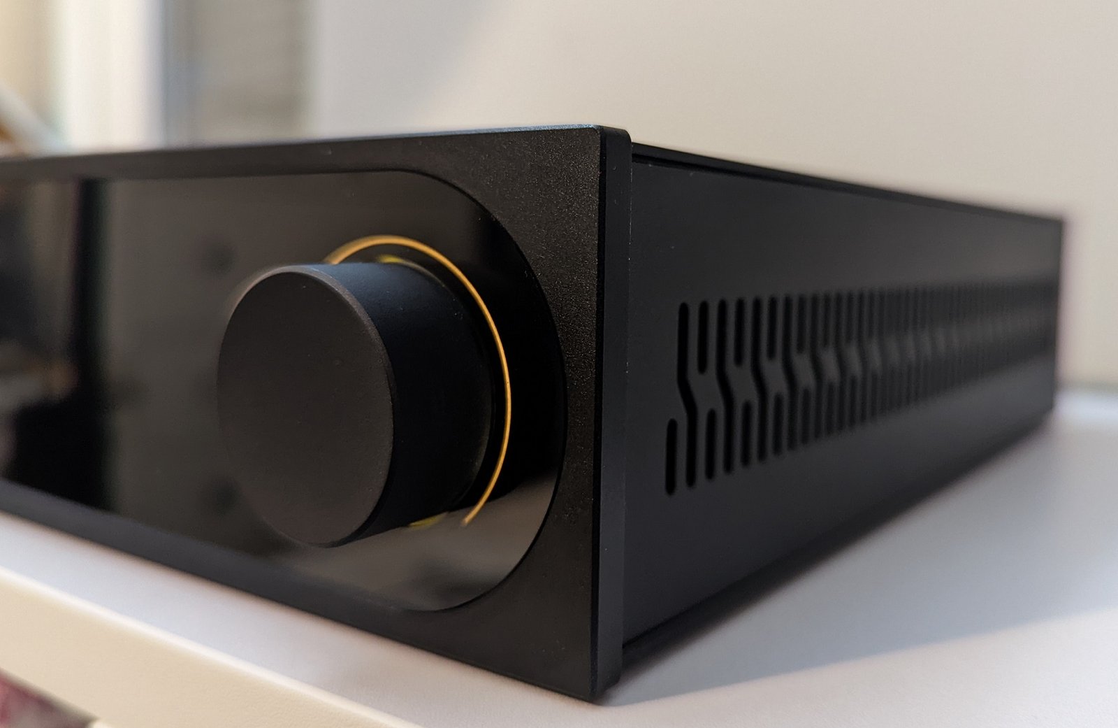 Laitteen etureunassa oleva äänenvoimakkuuden säädin ei ole paras mahdollinen, sillä sitä täytyy pyörittää todella vimmatusti. Yksi kiekon pyöräytys muuttaa äänenvoimakkuutta vain vähän, joten suuremmat säädöt tuntuvat hitailta ja työläiltä. Tämän vuoksi kaukosäätimen käyttäminen on mielestäni suositeltavaa, mikäli DAC:ia käytetään äänenvoimakkuuden säätimenä muille laitteille.