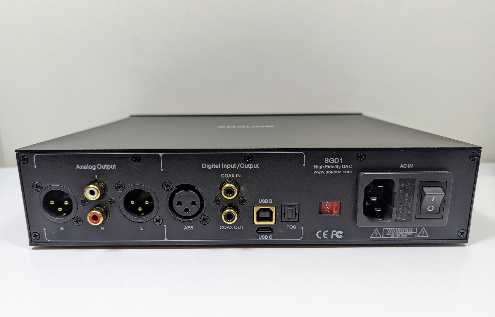 SGD1:n takaa löytyy erittäin kattavat liitännät sekä virtakytkin. Pidän siitä, että laitteessa on kaksi USB-tuloliitintä (USB-B ja USB-C), joita voidaan käyttää toisistaan erillään. Laite vastaanottaa digitaalista signaalia myös optisen- ja koaksiaalisen SPDIF-liitännän kautta sekä ammattikäyttöön suunnatulla AES-liitännällä. SGD1 kykenee lähettämään digitaalista signaalia eteenpäin toiselle DAC:ille koaksiaalisella SPDIF-liitännällä. DAC:in rakenne on balansoitu, joten siitä löytyy RCA-lähtöliittimien lisäksi myös XLR-liittimet.