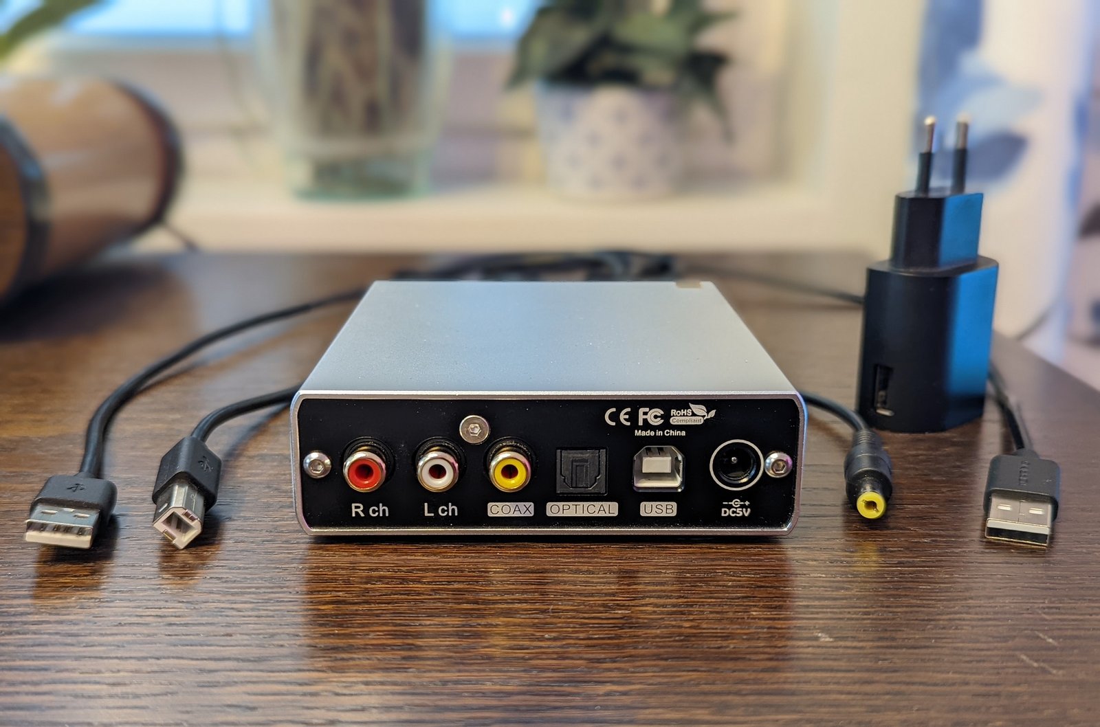Laitteen mukana toimitetaan kaksi USB-piuhaa, joista toista käytetään äänen siirtämiseen ja toista virransyöttöön. Virtapiuha voidaan kiinnittää esimerkiksi tavalliseen 5 voltin puhelinlaturiin tai suoraan tietokoneen USB-liittimeen. Vaikken ole huomannut näiden välillä omassa käytössäni minkäänlaista äänenlaadullista eroa tai häiriöääniä, erillisen laturin käyttäminen ainakin vähentää häiriöiden mahdollisuutta. Jotkin tietokoneet laskevat ärsyttävästi häiriöääniä, kuten virransyötön kelojen vinkumista, läpi USB-porttien kautta.