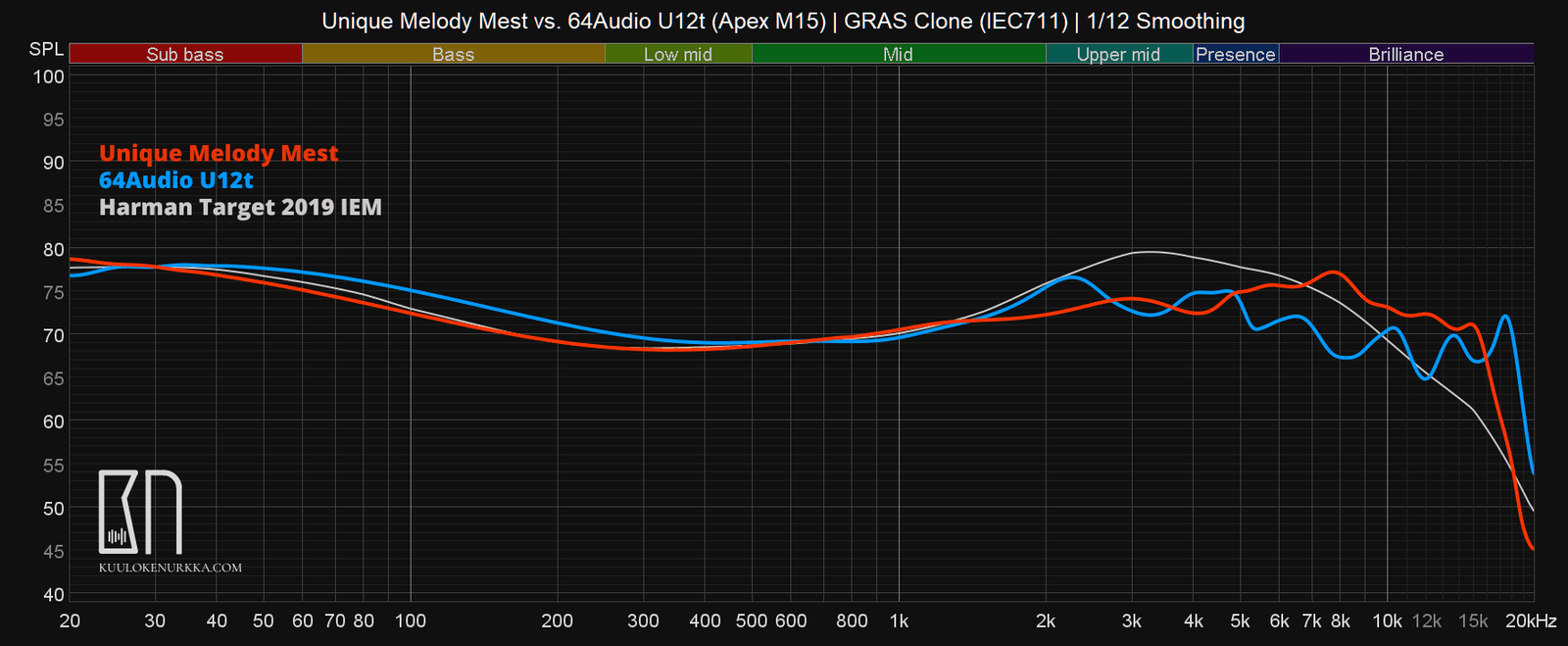 Sekä Mest että U12t ovat fantastisen yksityiskohtaisia in-ear-kuulokkeita, jotka vertautuvat tasaväkisesti hintaviin over-ear-malleihin. Tuunauksen osalta Mest tavoittelee energisempää ja kirkkaampaa ääntä, kun taas U12t on selvästi täyteläisemmän ja rauhallisemman kuuloinen. Nämä tyylilliset erot tulevat hyvin ilmi mittaamistani taajuusvasteista: U12t painottaa toistossa enemmän alataajuuksia ja Mest ylätaajuuksia.