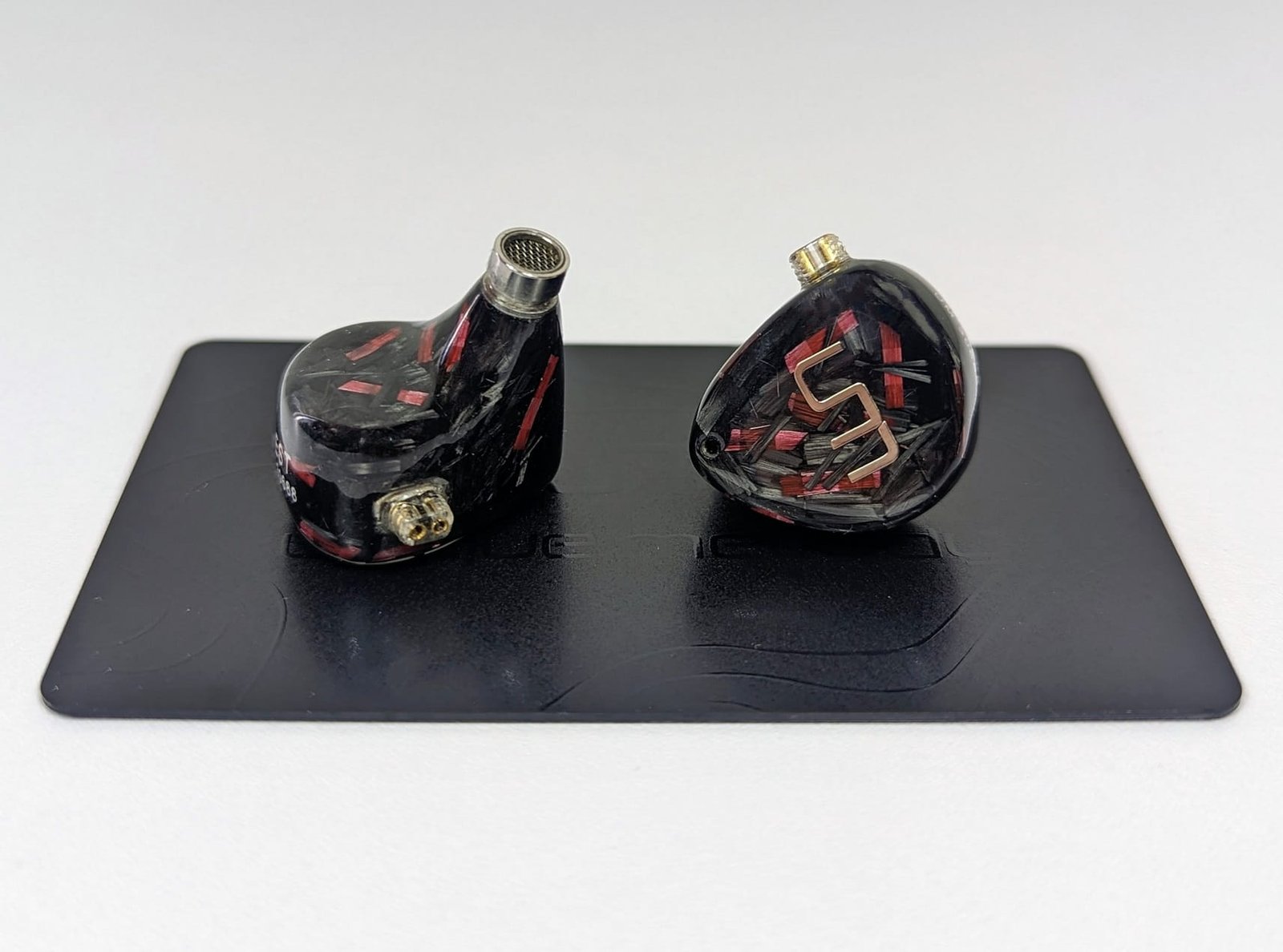 Mest:in varsin suurikokoinen runko on tehty hiilikuidusta, jonka seassa on koristeena punaiseksi värjättyjä kuituja. Toisessa kuulokkeessa lukee metallinhohtoisilla kirjaimilla UM ja toisessa Uniquemelody. Kuulokkeiden ulkonäkö on mielestäni kauempaa katsottuna hillityn tyylikäs, kun taas lähempää katsottuna hiilikuitumateriaalissa on kiehtovaa syvyyttä. Laatuvaikutelma on kaiken kaikkiaan erinomainen.