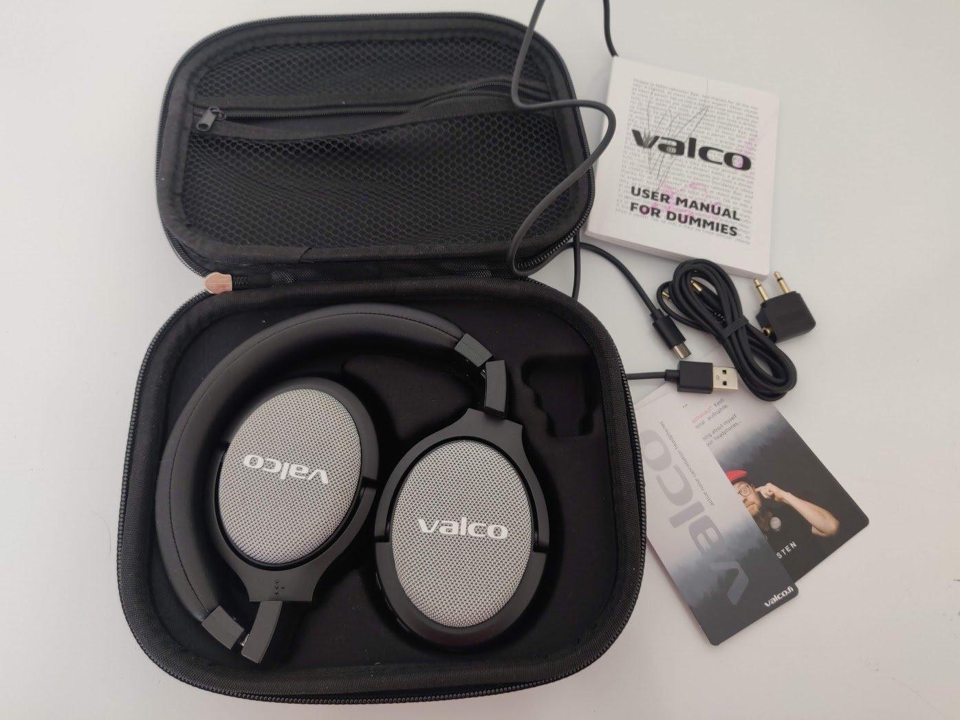 Varusteissa ainoa valituksen aiheeni on USB-C-latauskaapeli, joka saisi mielestäni olla hieman pidempi. Noin 80 senttiä pitkä kaapeli yltää huonosti pöydälle, jos kuulokkeita ladataan lattian tasossa olevasta pistorasiasta. Erillistä virtalähdettä kuulokkeiden mukana ei toimiteta. Valmistaja suosittelee käytettäväksi standardin mukaista 5V/1,5–2A USB-latauslähdettä. Itse olen ladannut kuulokkeita pääasiassa tietokoneen USB-portin kautta, sillä useimmat taloudestani löytyvät 5V-laturit ovat liian tehokkaita. Valcon manuaalin mukaan turbolatureiden käyttäminen saattaa aiheuttaa ns. ”kyrvähtämistä”.