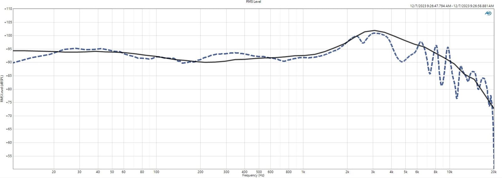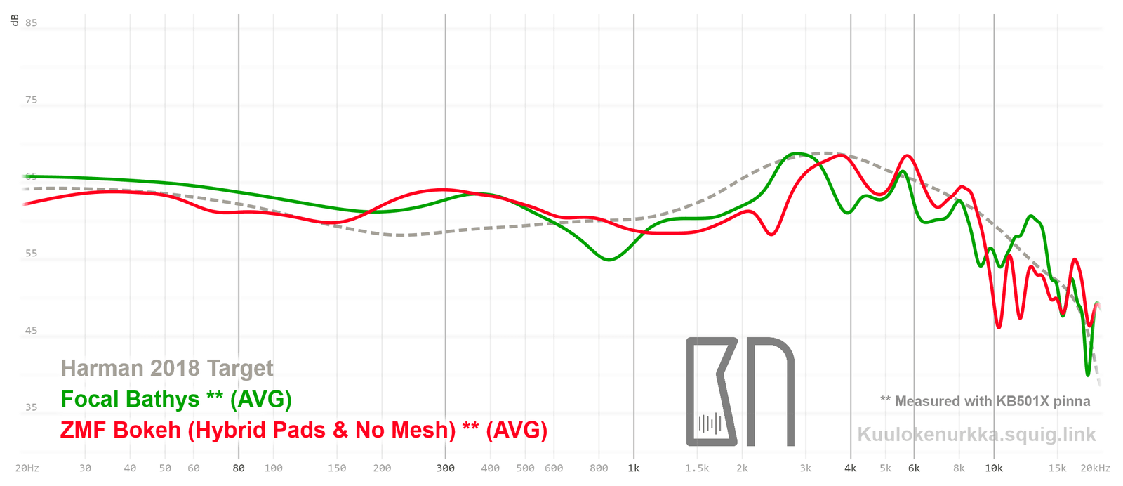 Tässä välissä lienee sopiva hetki mainita, että omalla laitteistollani mitattu Bokeh:in taajuusvaste täsmää yleisesti ottaen varsin huonosti subjektiivista kokemustani kuulokkeiden äänestä. Tämä johtuu nähdäkseni elementin sijainnista kehyksessään sekä ihmisen päähän muotoilluista pehmusteista. Mittauslaitteen korvia ympäröivien tasaisten metallireunusten kanssa istuvuus ei vastaa täysin sitä, mitä se on omassa päässäni. Itselleni elementti asettuu luontaisesti sopivaan kohtaan korvan eteen, kun taas mittauslaitteessa yksittäisen mittauskerran tulos riippuu merkittävästi siitä, miten kuulokkeet on aseteltu korvaan nähden. Alla näkyvät valmistajan tekemät mittaukset osoittavat, miksi pidän Bokeh:in keskitaajuuksia hybridi-pehmusteilla omiin mittauksiini nähden tasapainoisempina. Toisaalta en koe kuulokkeita aivan yhtä Harman-tyylisiksi, joten totuus saattaakin löytyä omalla kohdallani kaksien eri mittausten välimaastosta.