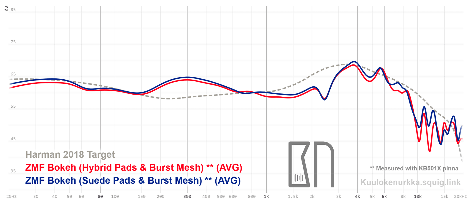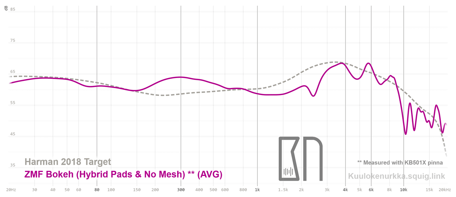 Our frequency response measurements have been made with a clone IEC-60318-4 coupler and KB501X pinnae. The Harman target curve from 2018 is used as a reference point and generalization of the headphone response that would sound good to most people. For more information on the measurements and their accuracy, see Headphone Measurements-sivulta (päivitetty hiljattain kattavammaksi). Bokeh:in taajuusvaste eri korvapehmustevaihtoehdoilla on myös vertailtavissa muiden mitattujen kuulokkeiden kanssa Squiglink avulla.