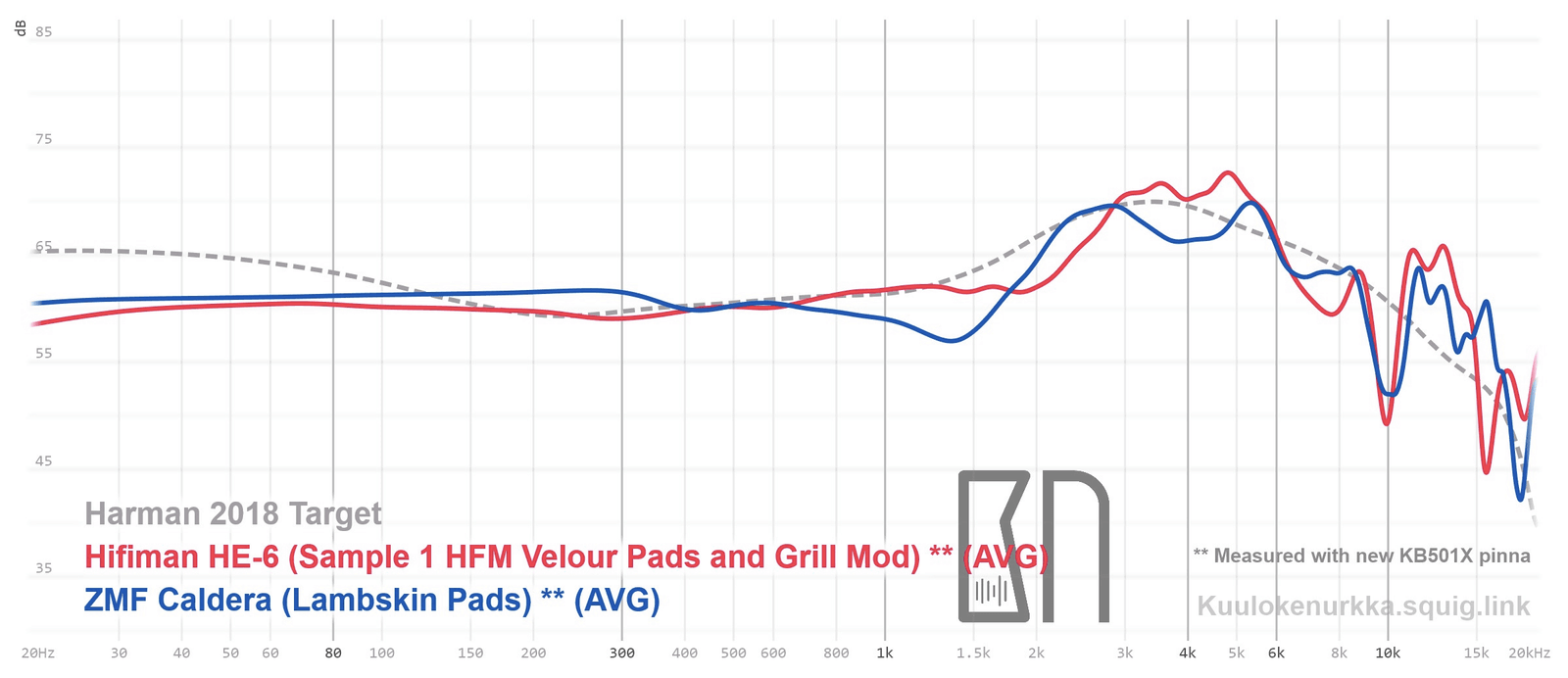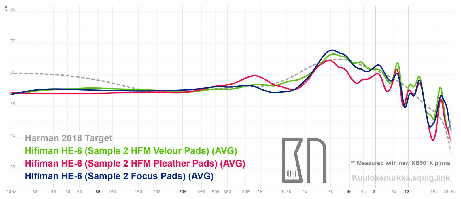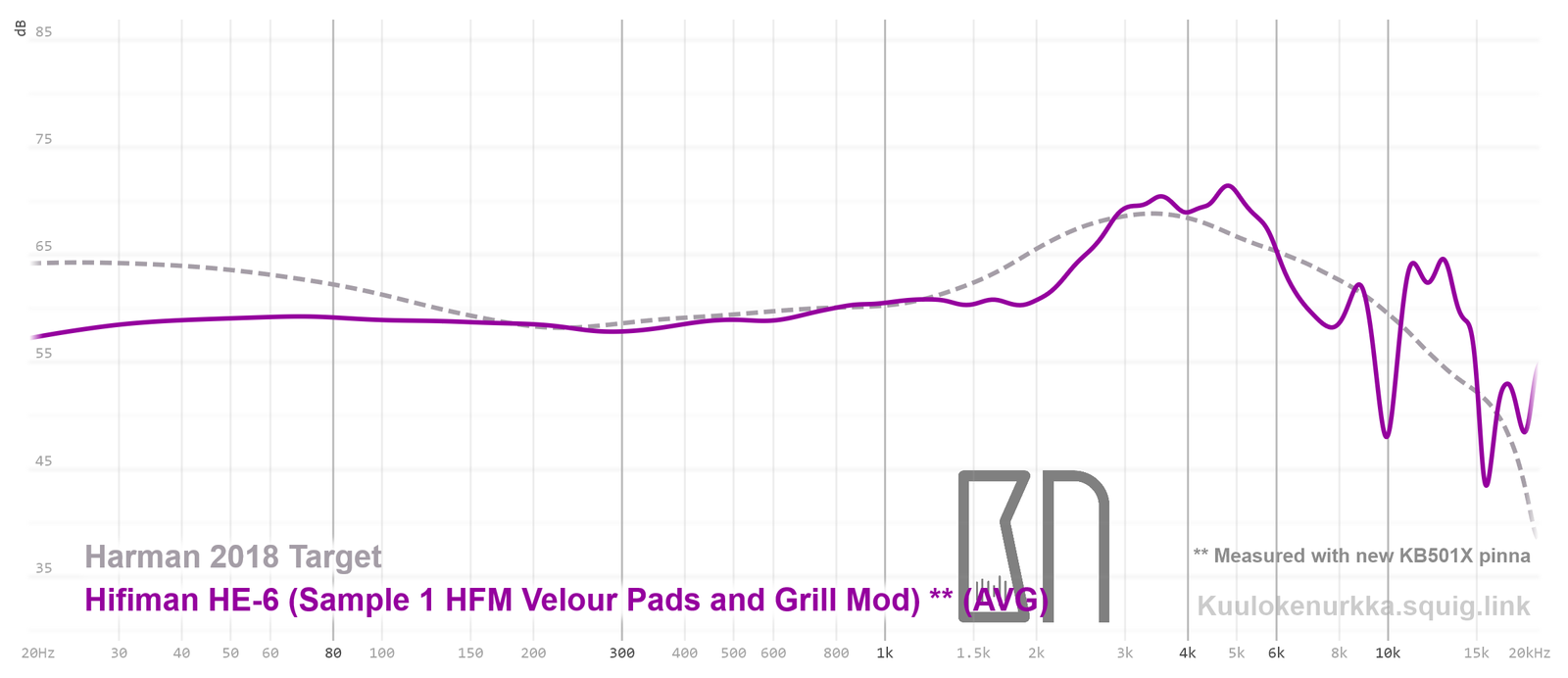 The headphone frequency response measurements were made using IEC711 standard equipment and new, more accurate silicone ears (KB501X). The graphs use the scientifically based Harman target curve (2018 version) as a reference, which is a generalisation of the frequency response that most people think would sound good. For more information on the measurements and their accuracy, see Headphone Measurements-sivulta. HE-6:n taajuusvaste on myös vertailtavissa muiden mitattujen kuulokkeiden kanssa comparison tool avulla.