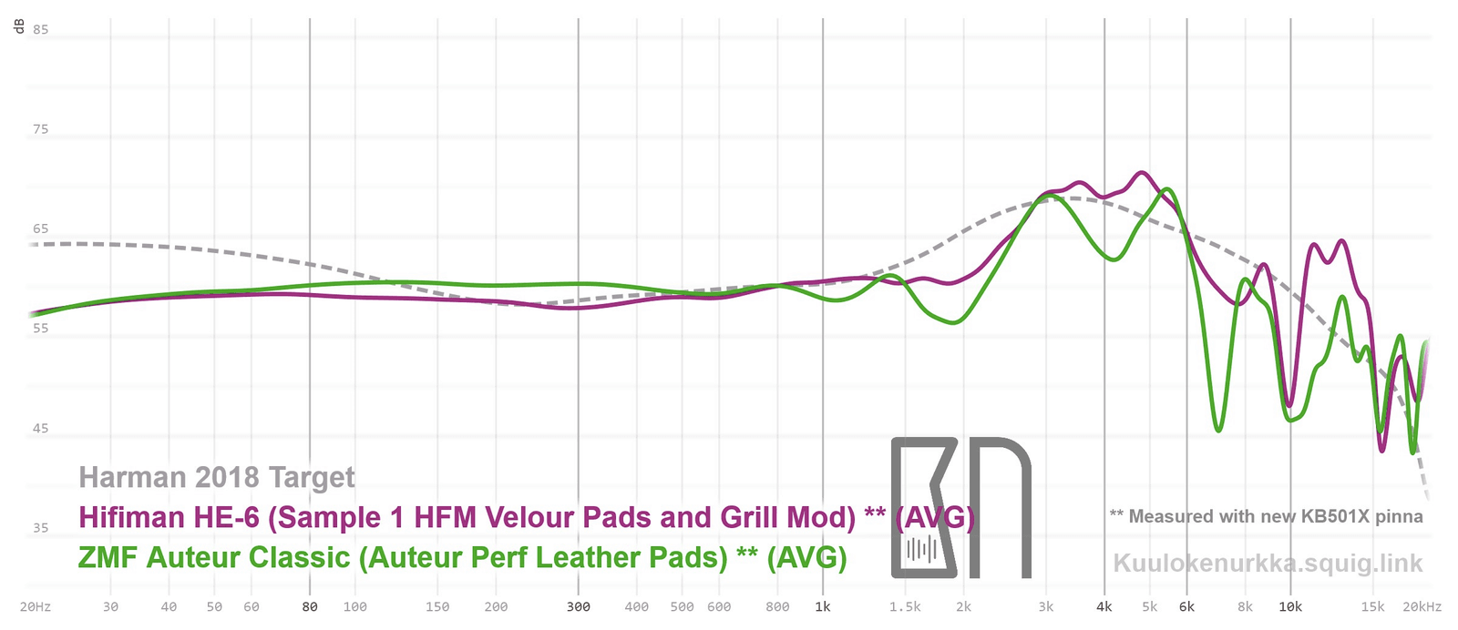 Vaikka HE-6 onkin jo hieman iäkkäämpi tuote, eikä sitä myydä enää uutena, vertaan sitä vielä pikaisesti pariin muuhun käytössäni olevaan kuulokemalliin. Ensimmäiseksi vertailtavaksi tuotteeksi valitsin ZMF:n Auteur Classic -kuulokkeet, koska ne asettuvat lähelle samaa noin 1500 euron hintaluokkaa. Periaatteessa osuvampi verrokki voisi kuitenkin olla esimerkiksi jokin Audezen planaarikuuloke, kuten LCD-X tai MM-500. Näitä minulla ei kuitenkaan ole, joten käytän toisena verrokkina taajuusvasteeltaan melko vastaavaa LCD-R-mallia. Jos ja kun pääsen jossakin vaiheessa arvostelemaan Hifimanin Arya Organic -mallin, palaan silloin myös HE-6:een.