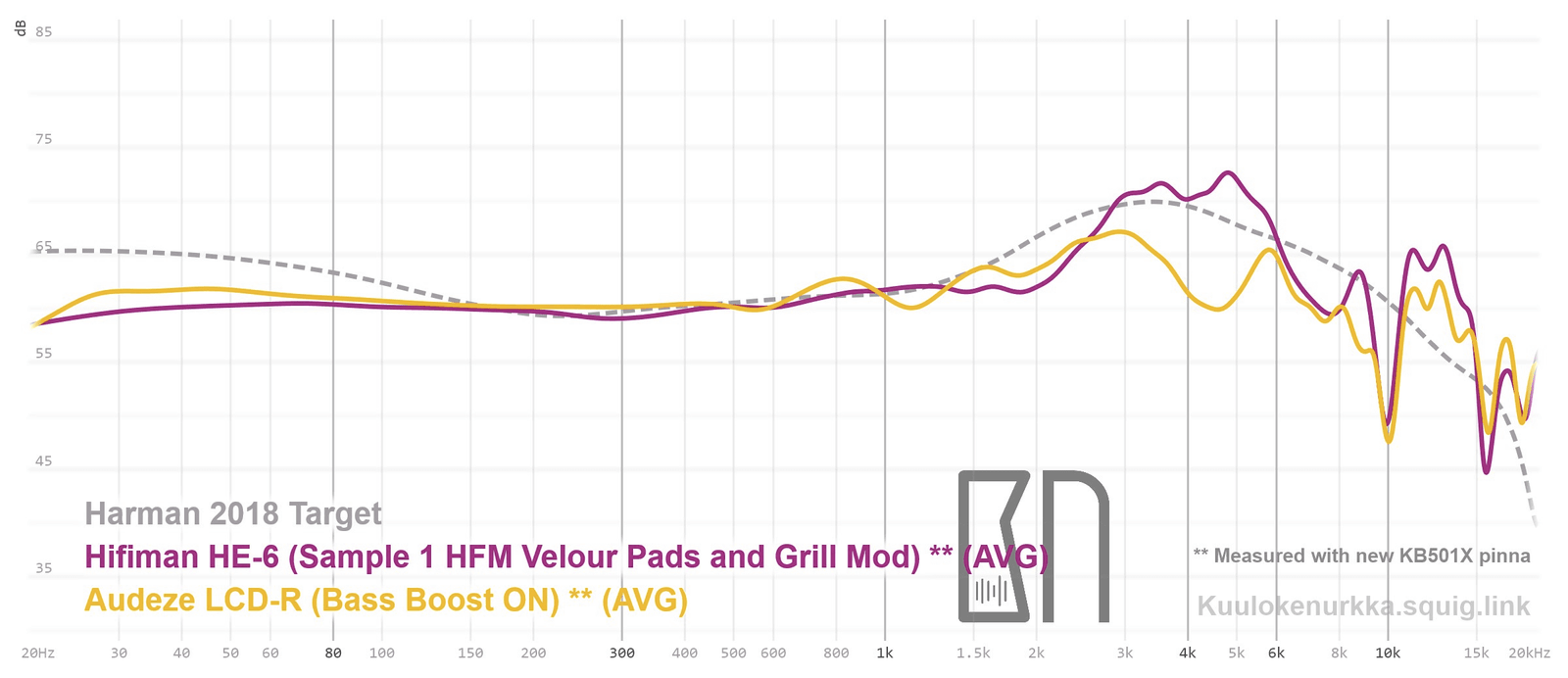HE-6 ja LCD-R ovat mielenkiintoisesti omalla laitteistollani mitattuna taajuusvasteiltaan yllättävänkin samanlaisia 3–6 kHz:n välillä sijaitsevaa massiivista eroa lukuun ottamatta. Ilman Schiit Audion vahvistimesta Audezen kuulokkeille aktivoimaani basson voimistusta alataajuudet olisivat molemmissa kuulokkeissa määrältään melko identtiset. HE-6 kuulostaa tosin basson osalta sekä voimakkaammin iskevältä että erottelevammalta.