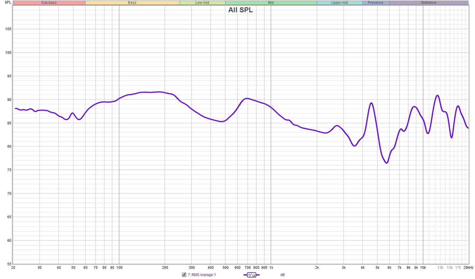 Kennerton Magni V3:n taajuusvaste mitattuna MiniDSP EARS:lla käyttäen HEQ-kompensaatiota ja 1/12 octave smoothing -menetelmää. Käyrä esittää molempien kanavien keskiarvoa, joka on tuotettu mittaamalla kuulokkeet useassa eri asennossa.