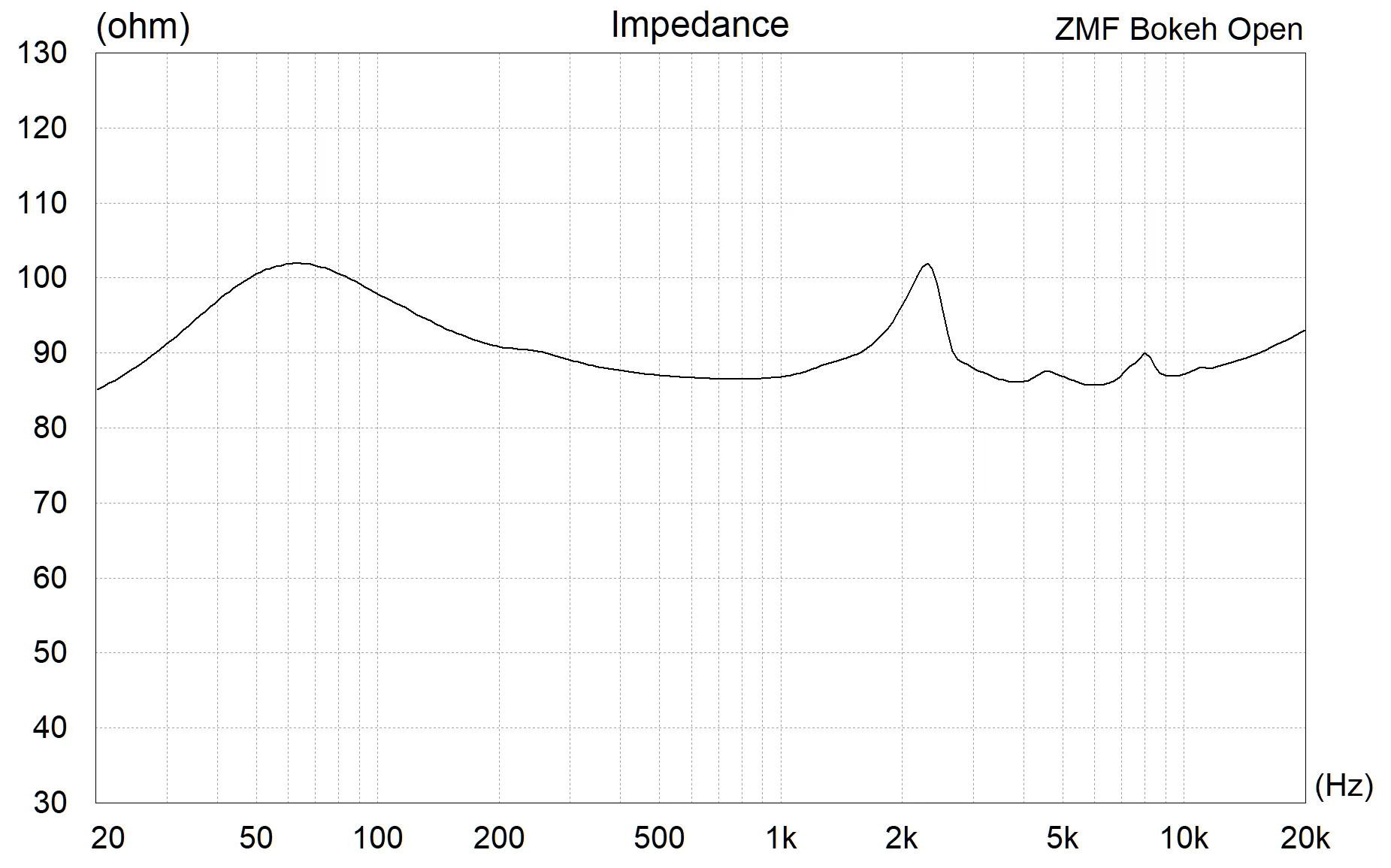 ZMF claims a nominal impedance of 80 ohms for Bokeh Open, but in reality, the impedance curve is somewhat peculiar in its irregularities. Typically for dynamic drivers, the impedance rises slightly upwards at bass frequencies – in this case to just over 100 ohms. A similar rise also occurs around 2 kHz. Fortunately, these impedance peaks do not have a significant effect on the sound, even if the headphones were used with an amplifier having high output impedance. The 120 ohm output impedance I tested boosted the bass and the 2.3 kHz region by only 0.75 decibels compared to an output impedance of less than 1 ohm. The damping factor of the drivers did weaken, however, so the sound changed slightly tonally in any case. Due to their fairly high sensitivity (103 dB/mW), Bokeh Open's drivers are relatively easily driven even by low-power mobile devices, which ZMF seems indeed to have aimed for.