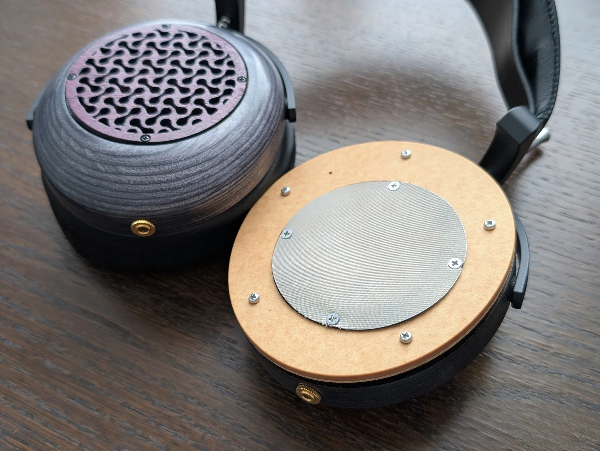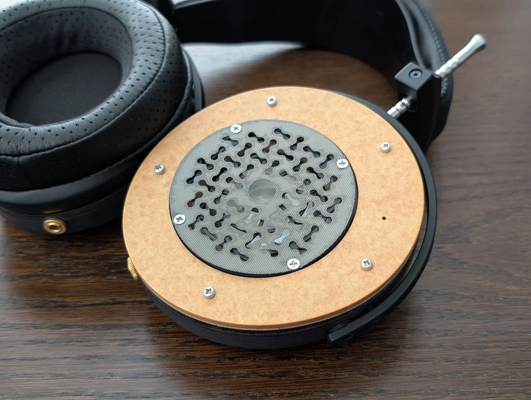 ZMF, in its traditional manner, offers several different earpad options for Bokeh Open, with which both wearing comfort and sound quality can be fine-tuned. The default earpads this time are of the hybrid type, meaning they are partly covered with leather and suede fabric. Additionally, in front of the driver, there is a partially perforated titanium mesh, which limits the amount of treble. This mesh can be swapped for a solid variant or removed entirely. In fact, the plastic rings I mentioned earlier, which possibly help with earpad attachment, also affect the frequency response, so the possibilities for modifying the sound are even more versatile than before. I myself this time chose not to buy the $120 tuning kit, because ZMF has made the default choices more carefully than for the closed Bokeh. On the other hand, I already owned solid titanium meshes, which I finally ended up using more permanently instead of the perforated meshes.