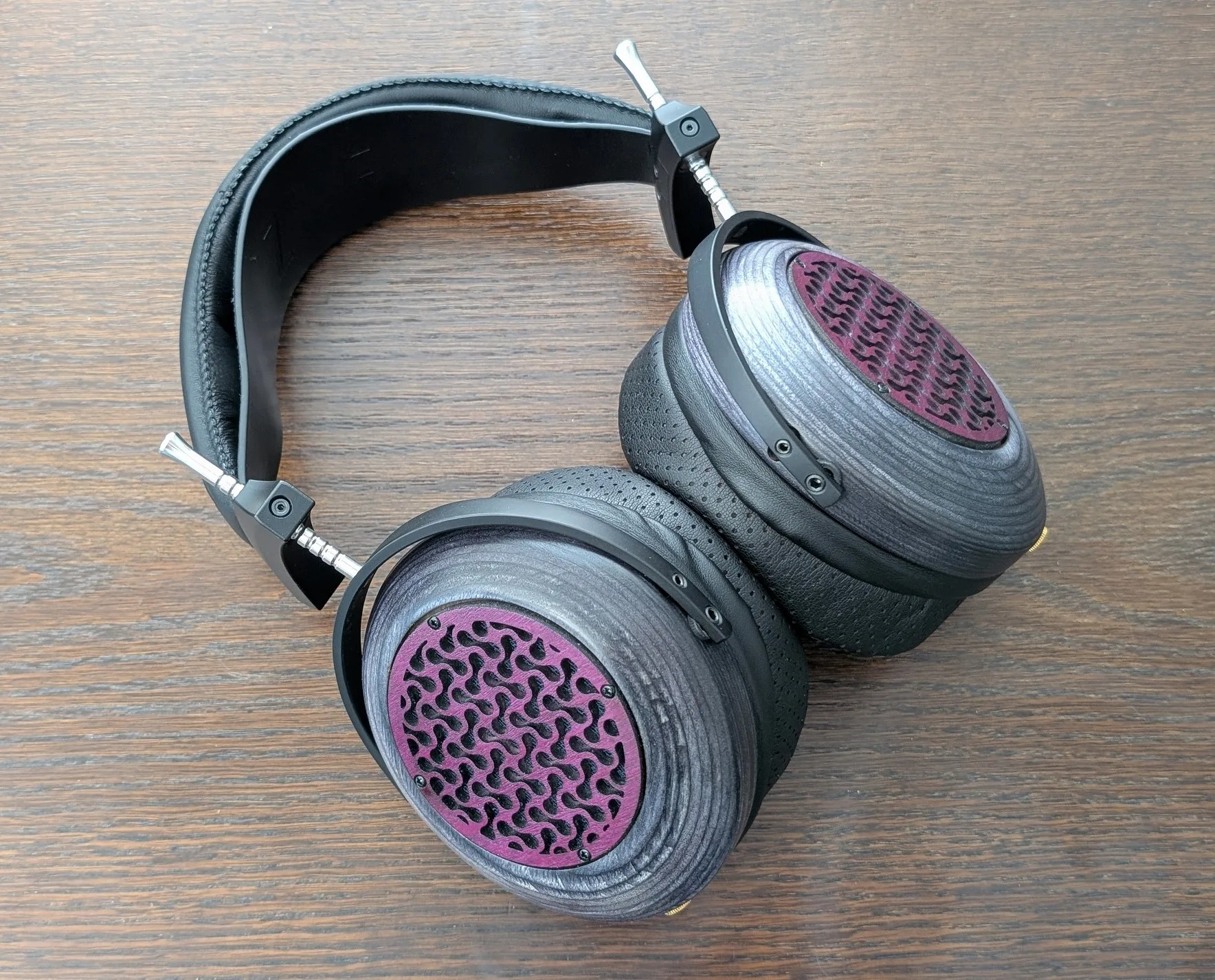I like purple, so the Nocturne version of Bokeh Open is perfect for me. As a second colour option at the time of release, the reddish Emberstone version would have been available. In both, the grilles on the cups, resembling small bones, are made of wood for the first time, unlike other ZMF models. The material for the cups, in turn, is interestingly coloured plywood, which might initially sound like a cheap material unless one knew it was SpectraPly-branded premium plywood. ZMF could probably buy ordinary wood cheaper, so a certain kind of look has been intentionally sought for Bokeh Open. In the Nocturne version, the cups are grey and their grilles are purpleheart wood. Behind the grilles, a dark blue fabric has also been installed to add a little more contrast to the overall look. The manufacturer generally seems to be more experimental with Bokeh Open than before, as several different versions of the grille patterning have already been seen.