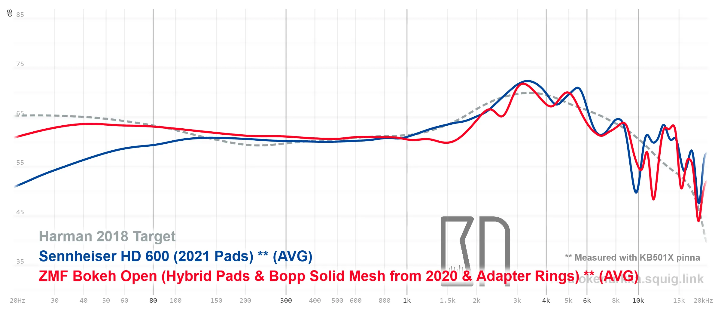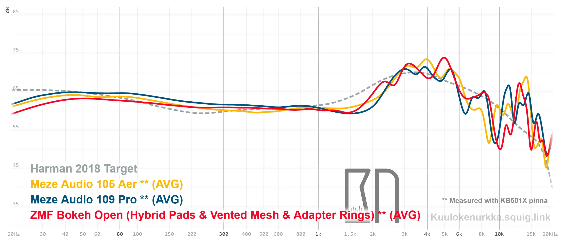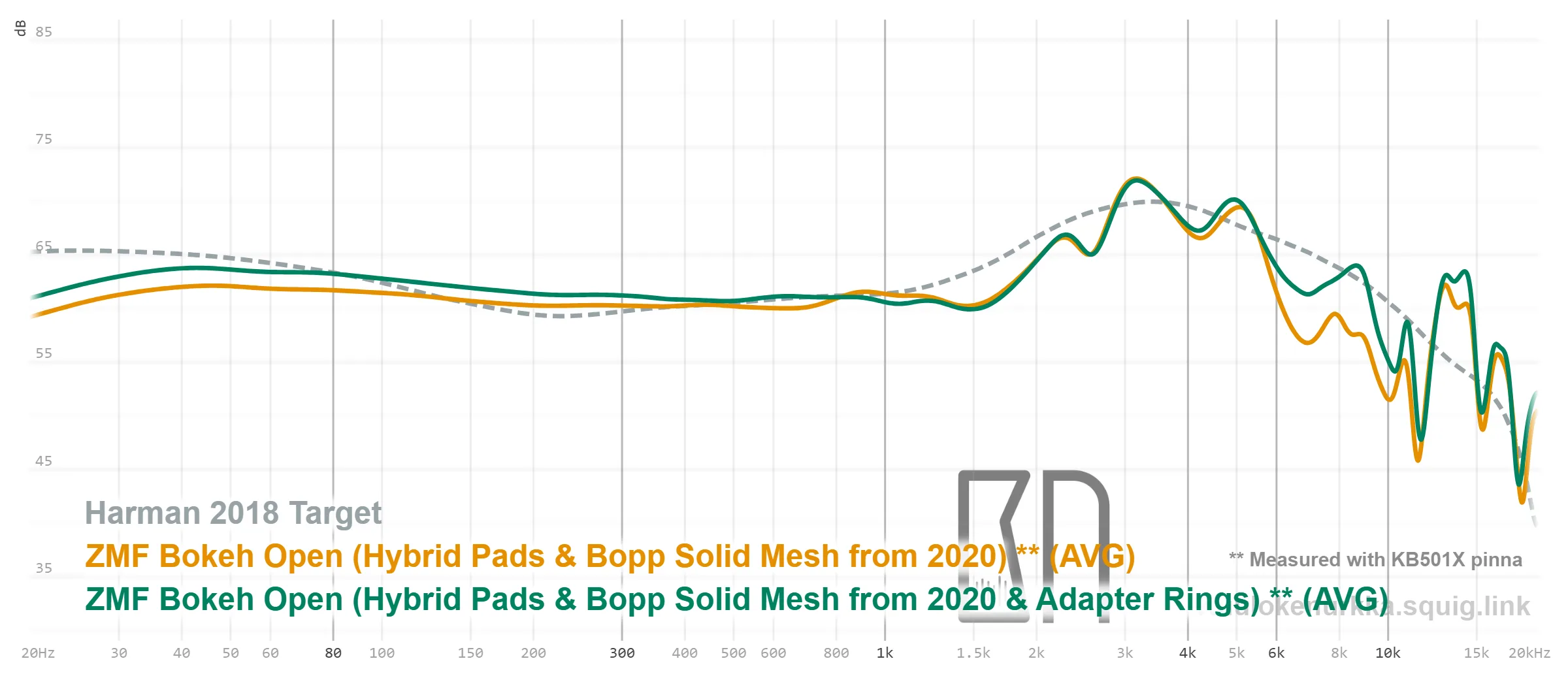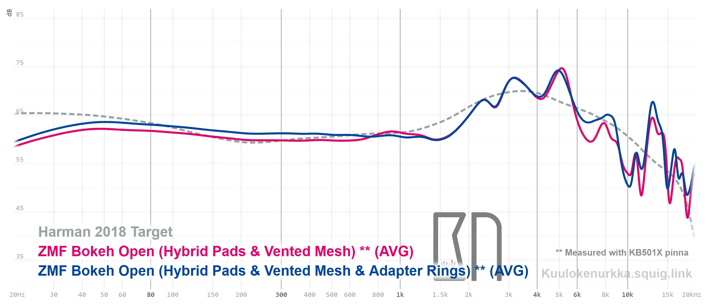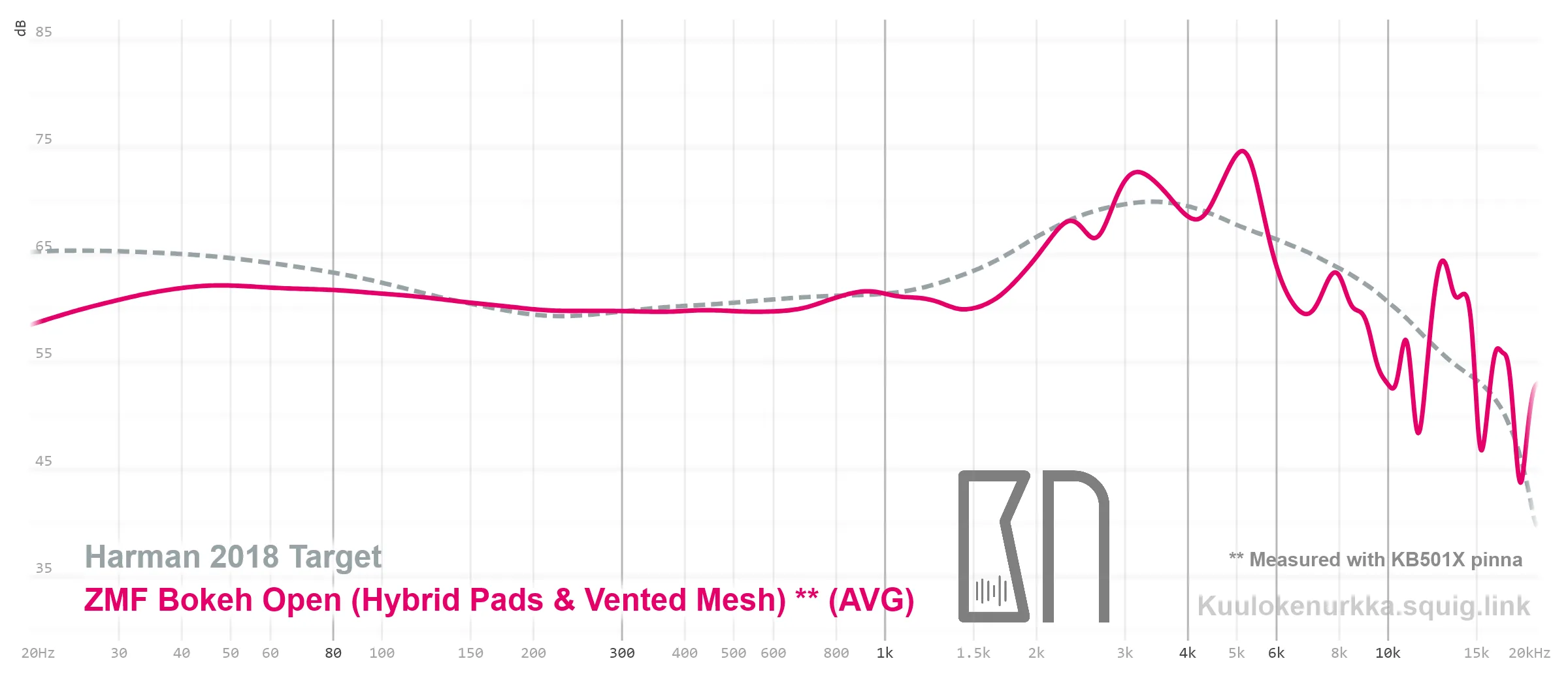 Our frequency response measurements have been made with a clone IEC-60318-4 coupler and KB501X pinnae. The Harman target curve from 2018 is used as a reference point and generalization of the headphone response that would sound good to most people. For more information on the measurements and their accuracy, see Headphone Measurements. All the measurements including Bokeh Open can be found and compared on Squiglink avulla.